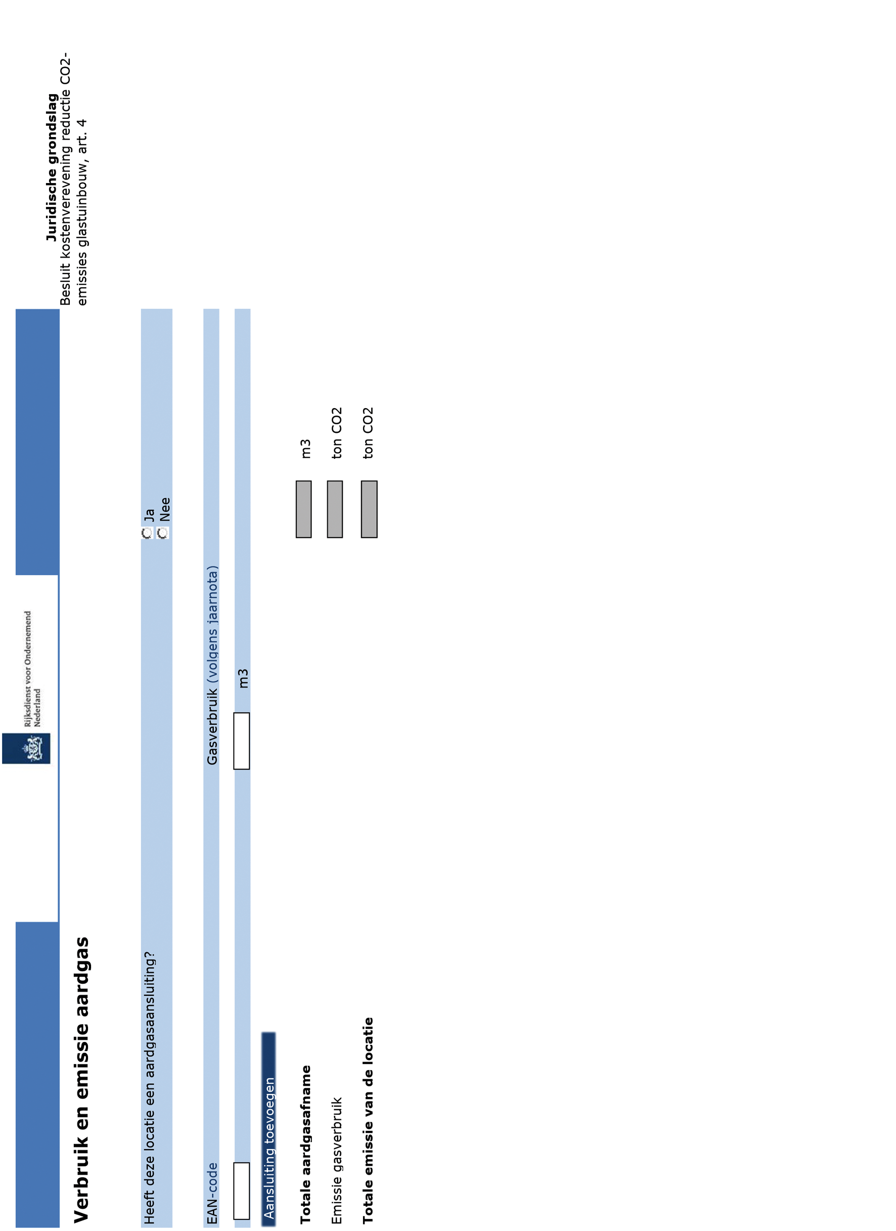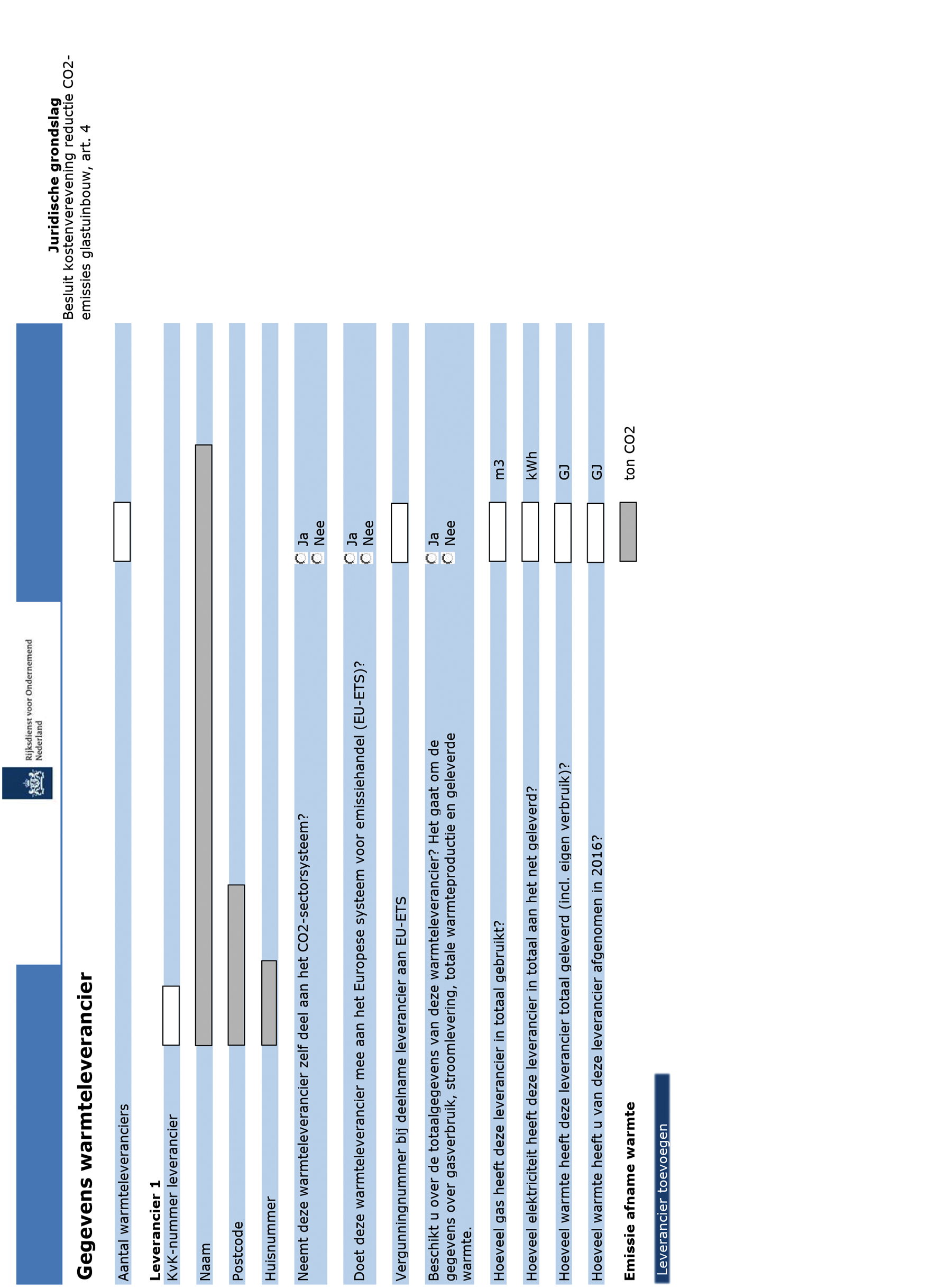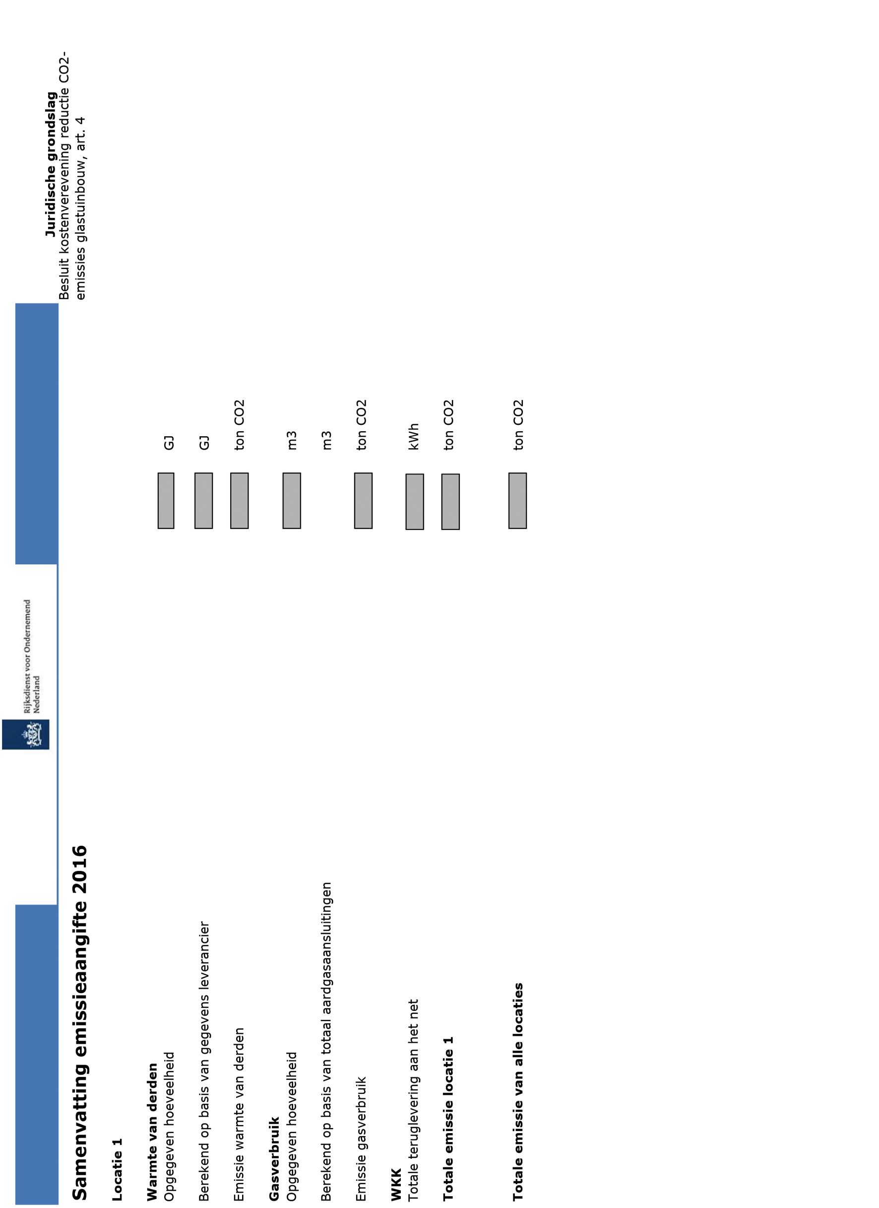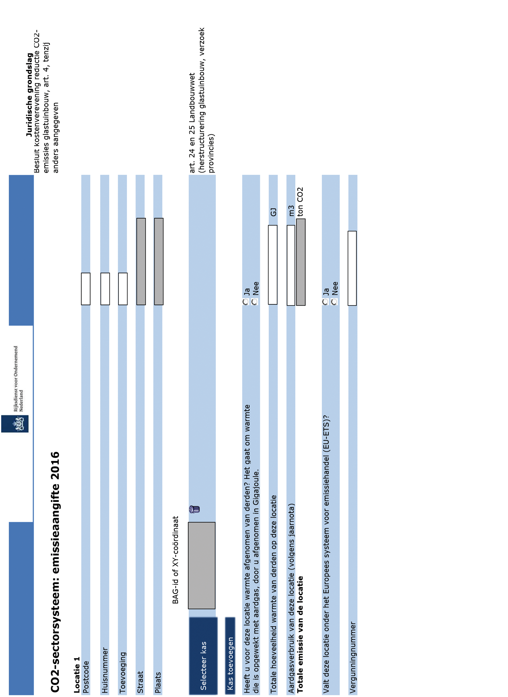 Op grond van het Besluit kostenverevening reductie CO2-emissies glastuinbouw kan de Minister regels stellen over de uitvoering van het CO2 kostenvereveningssysteem voor de glastuinbouw. Deze regels zijn opgenomen in de Regeling kostenverevening reductie CO2-emissies glastuinbouw. Op grond van die regels wordt onder meer de CO2 reductiedoelstelling gemonitord met een register dat tot 2015 bij het voormalig Productschap Tuinbouw was ondergebracht. Met ingang van 2015 houdt RVO.nl op basis van de Regeling kostenverevening reductie CO2-emissies glastuinbouw het register bij. In dat kader dienen glastuinbouwondernemingen jaarlijks vóór 1 juli de aangifte van de totale CO2-emissie door te geven. Gezien de ICT infrastructuur en interne werkprocessen van RVO.nl is deze aangifte opgenomen in de gecombineerde opgave.