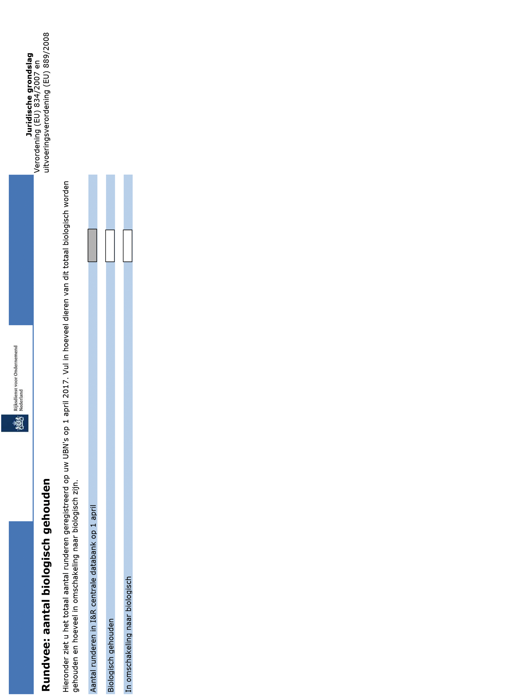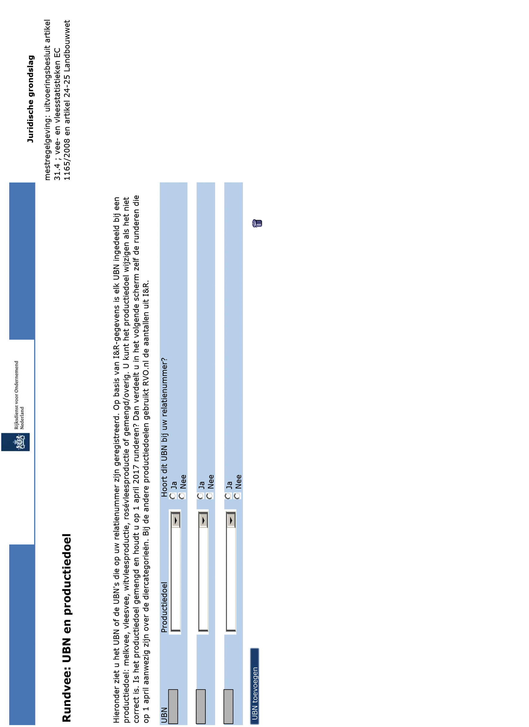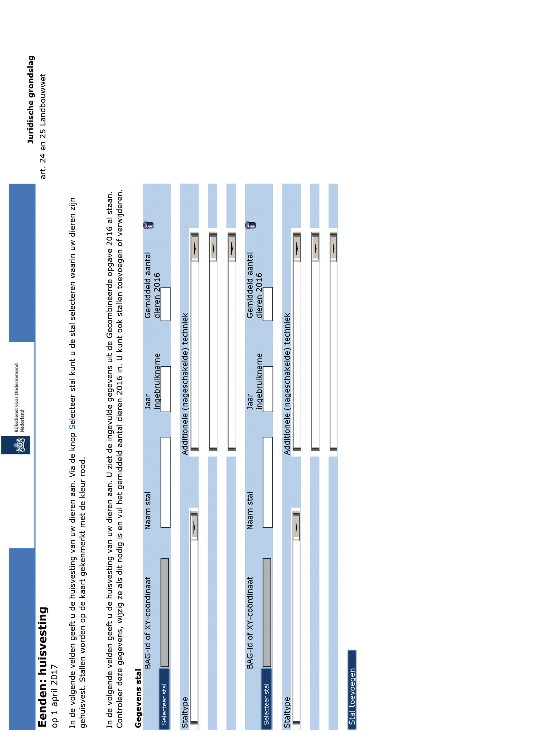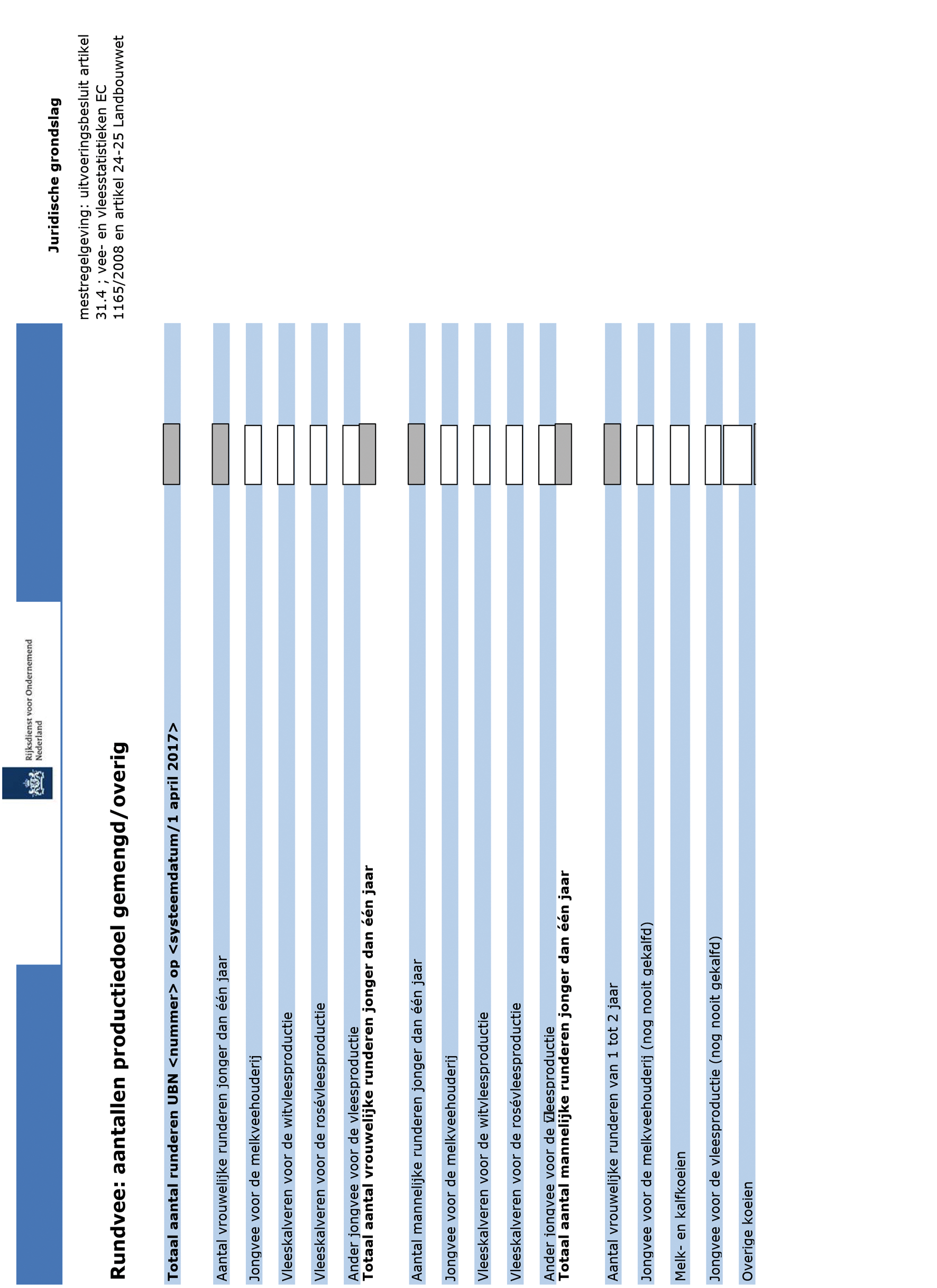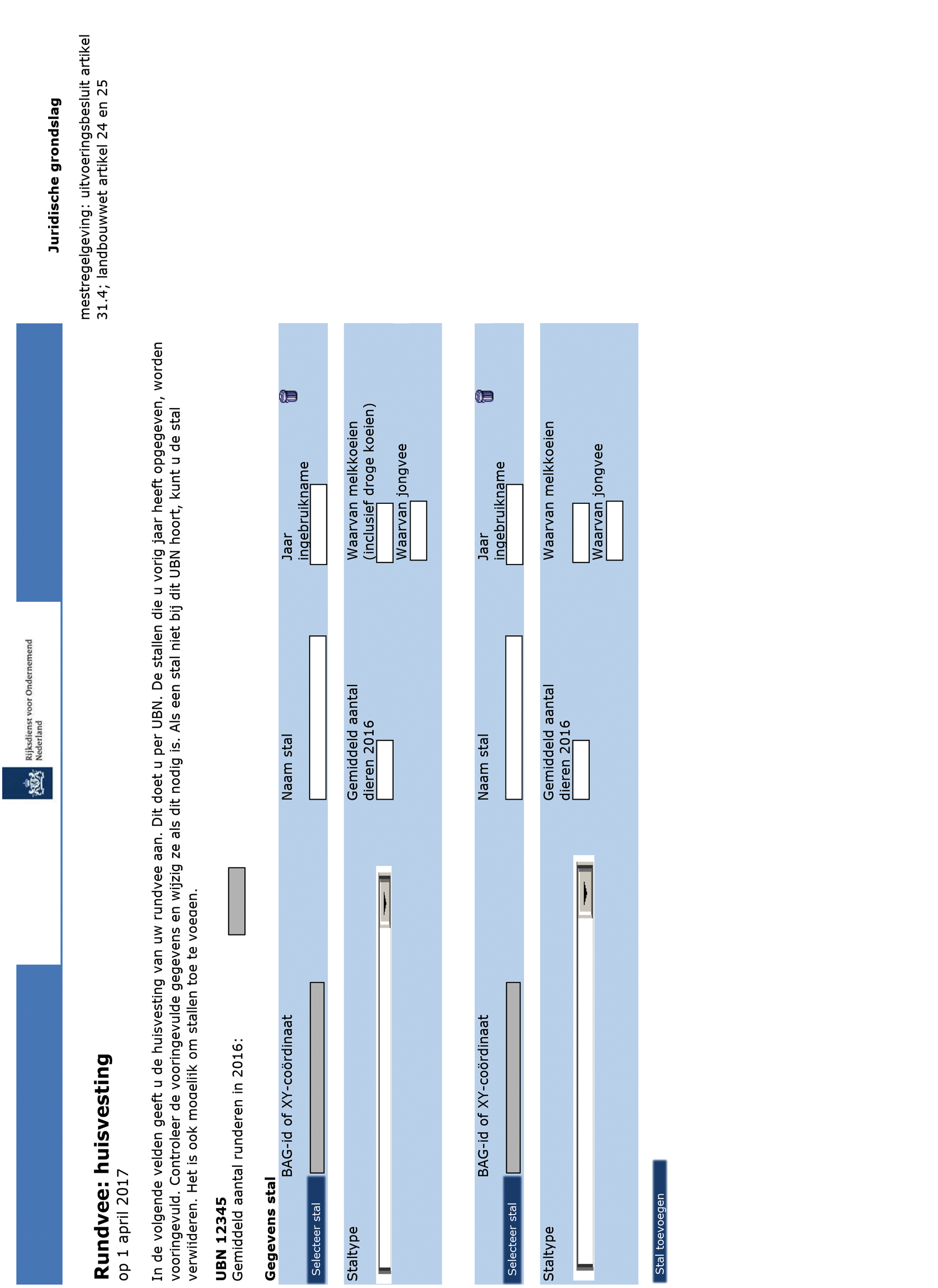 De vragen naar aantal stuks rundvee per 1 april 2017 en gemiddeld aantal per stal in 2016 zijn waar mogelijk vervallen door de gevraagde informatie af te leiden uit het register I&R. Het register I&R-rund bevat per bedrijfslocatie en per rund de informatie over geboortedatum, geslacht, aan- en afvoer UBN en eventueel sterftedatum. I&R-rund bevat geen informatie over het gebruiksdoel waardoor op locaties met zowel melk- als vleesvee naar aanvullende gegevens wordt gevraagd. Ook op locaties met meerdere stallen is aanvullende informatie nodig om inzicht te krijgen in de verdeling van de dieraantallen over deze stallen.
