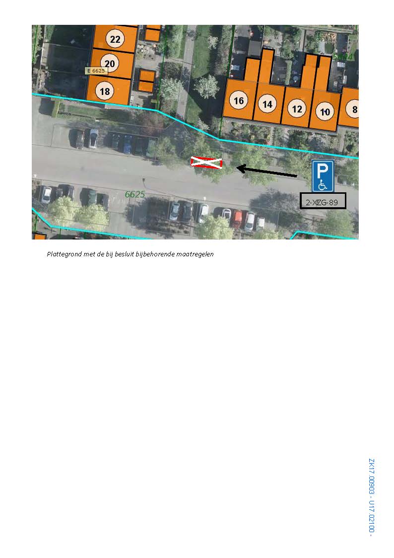- Het aanwijzen van een gehandicaptenparkeerplaats op kenteken nabij de woning van verzoeker aan de Doornbosch Hofstede 32 te Eerbeek door plaatsing van bord E6 van Bijlage 1 van het Reglement verkeersregels en verkeerstekens 1990 met onderbord (kenteken). Tevens wordt een kruismarkering toegepast in het betreffende, bestaande parkeervak conform bij dit besluit horende situatieschets.