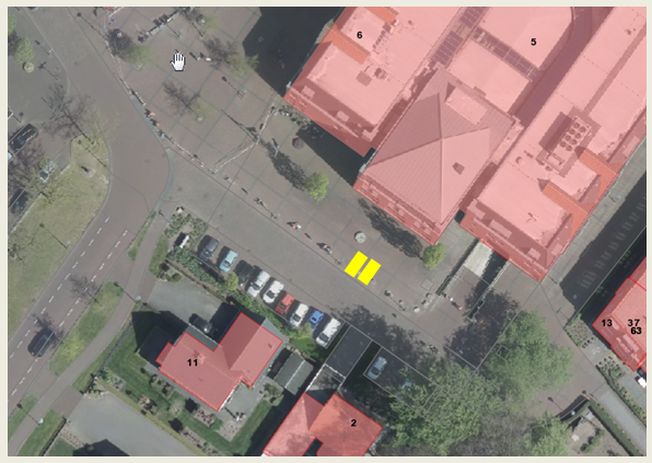 Aan de Sloetstraat in Dinkelland worden twee parkeerplaatsen gerealiseerd voor elektrische auto’s. Dat worden de parkeerplaatsen die met een geelvlak zijn aangegeven op de kaart hieronder: