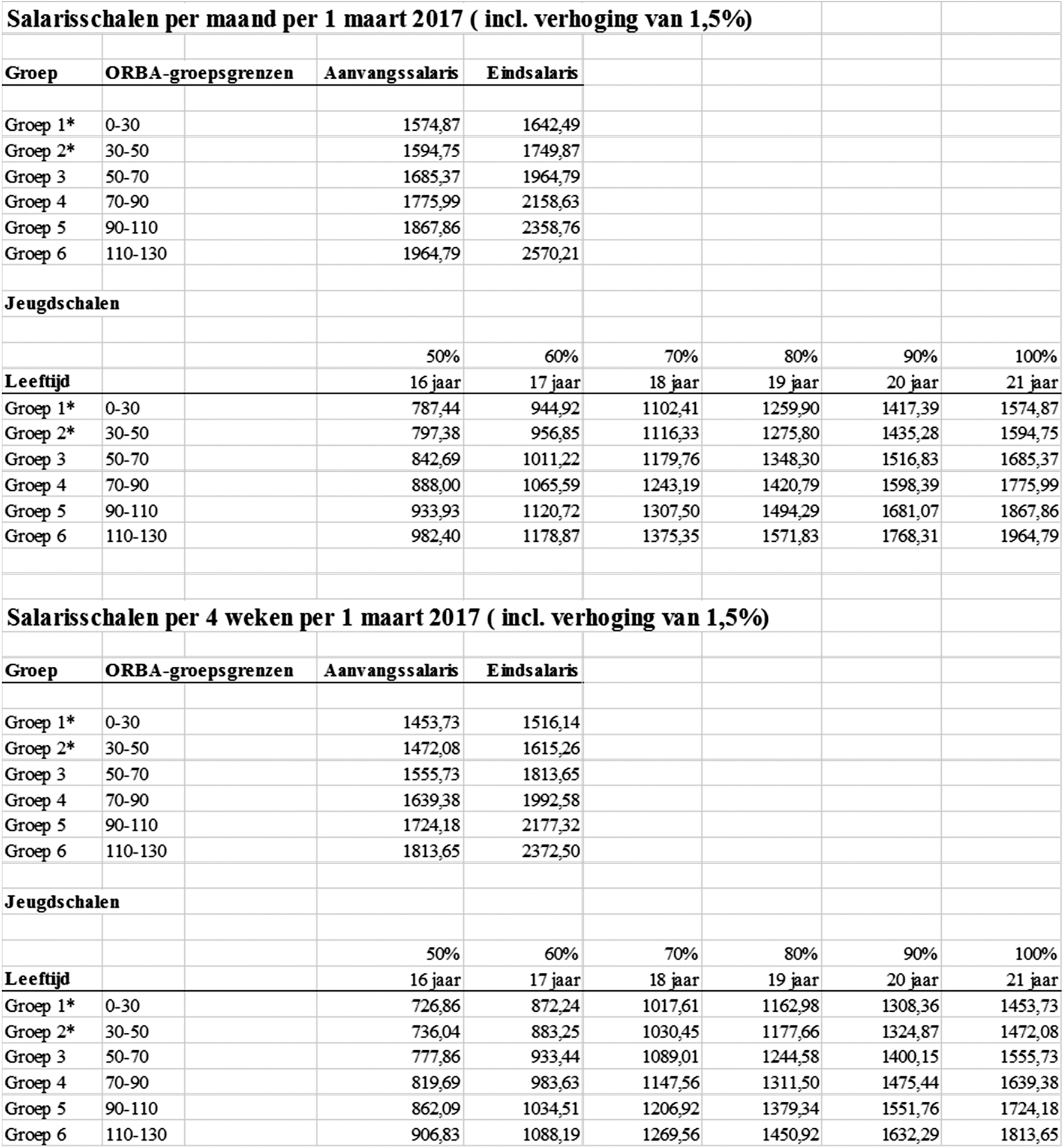 – 0,577% van het maandsalaris (het maandsalaris vermenigvuldigd met 3 gedeeld door 13 weken gedeeld door 40) of