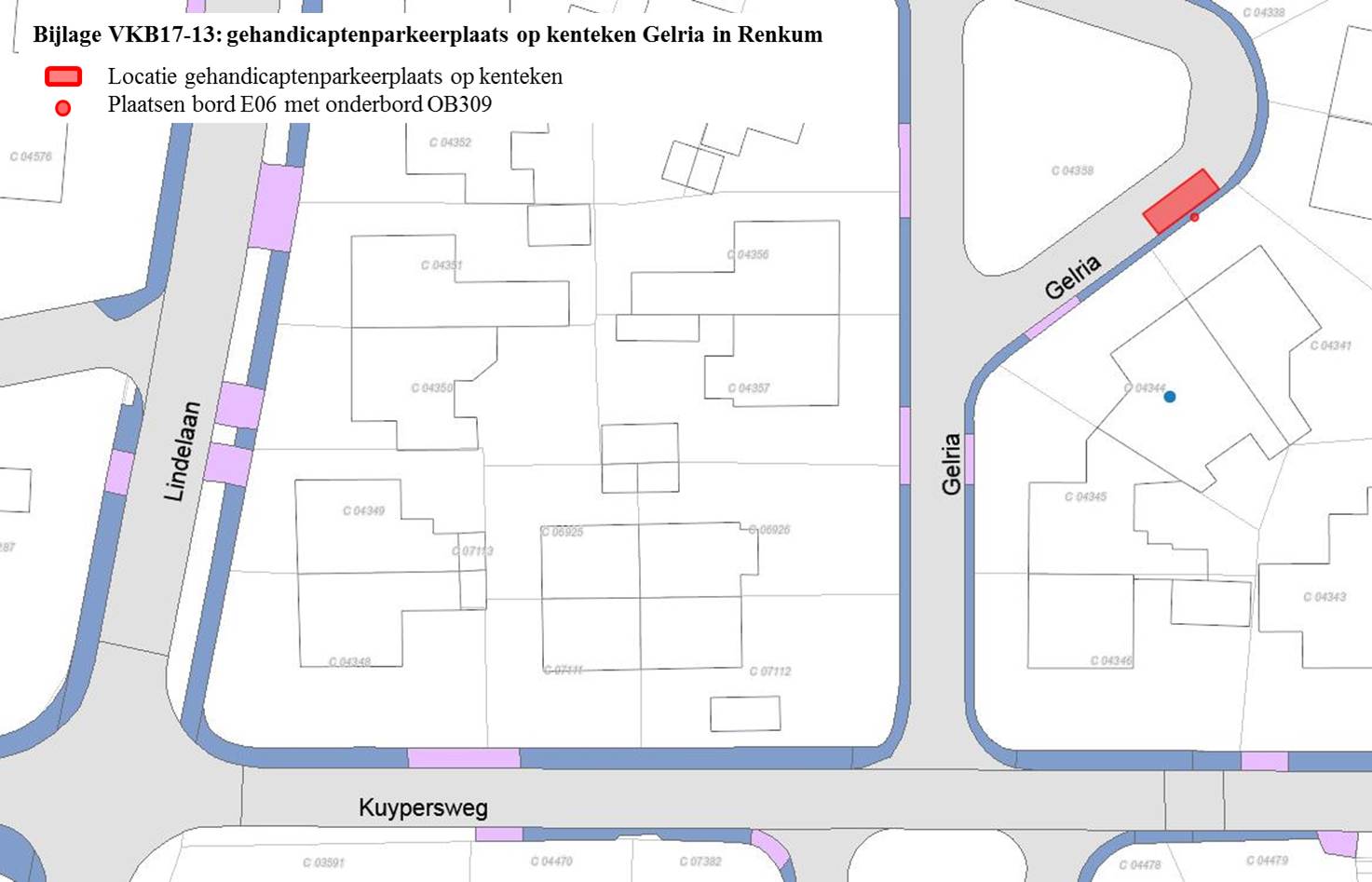 Door het plaatsen van het bord model E6 (Gehandicaptenparkeerplaats) van bijlage I van het Reglement Verkeersregels en Verkeerstekens 1990, voorzien van onderbord OB309 inclusief het aanbrengen van een symbool, een gehandicaptenparkeerplaats in te richten op het Gelria in Renkum, uitsluitend bestemd voor het door de begunstigde in gebruik zijnde motorvoertuig.