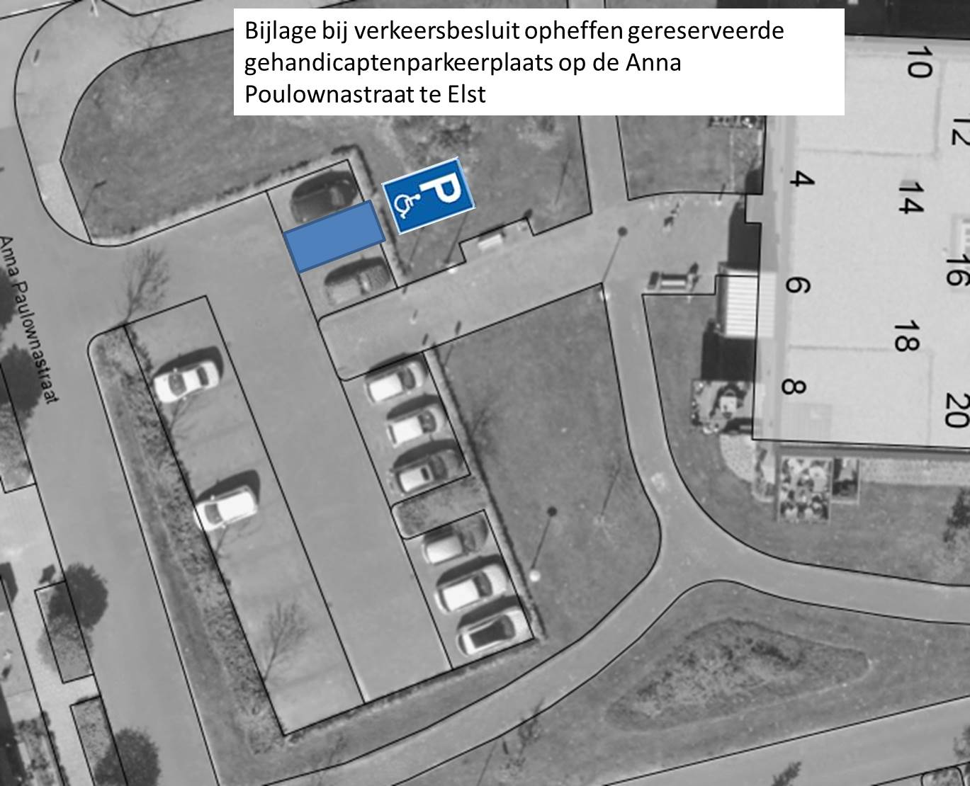 •De gebruiker van de gehandicaptenparkeerplaats in de Anna Poulownastraat te Elst heeft aangegeven geen auto meer te mogen besturen en heeft gevraagd of de gereserveerde gehandicaptenparkeerplaats opgeheven kan worden.
