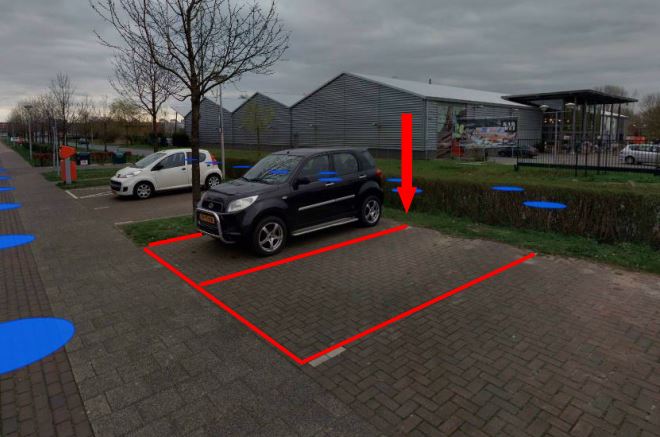 Souvenirperenlaan (ter hoogte van de zijkant van Williamsperenlaan huisnummer 39; het derde en vierde parkeervak voorbij de brievenbus en de invalidenparkeerplaats, komende vanaf de Williamsperenlaan richting de Souvenirperenlaan aan de linkerzijde van de weg)