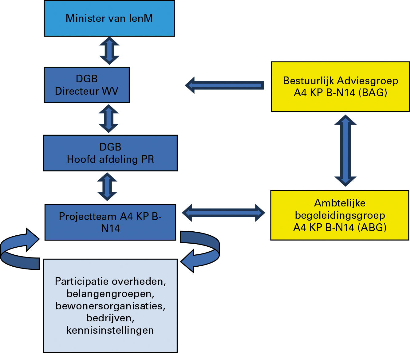Het Directoraat-Generaal Rijkswaterstaat (RWS) heeft een belangrijke rol als kennisleverancier, opdrachtnemer van de latere Planuitwerking en als wegbeheerder. Het projectteam A4 Knooppunt Burgerveen – N14 voert de MIRT-Verkenning uit in opdracht van de directeur WV. Het projectteam rapporteert aan het hoofd van de afdeling Programmering Rijkswegen (PR) van WV, tevens plaatsvervangend directeur WV, die op zijn beurt de directeur WV adviseert.