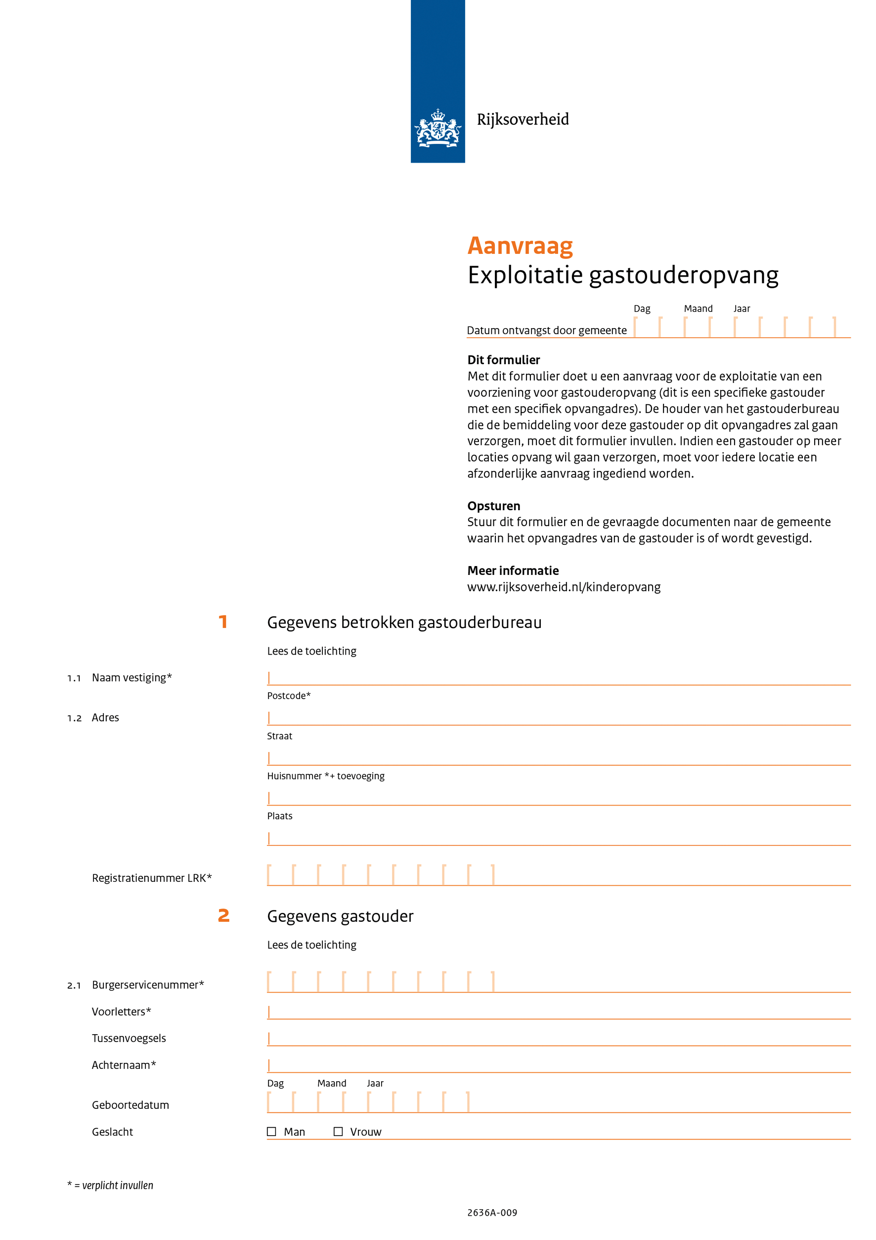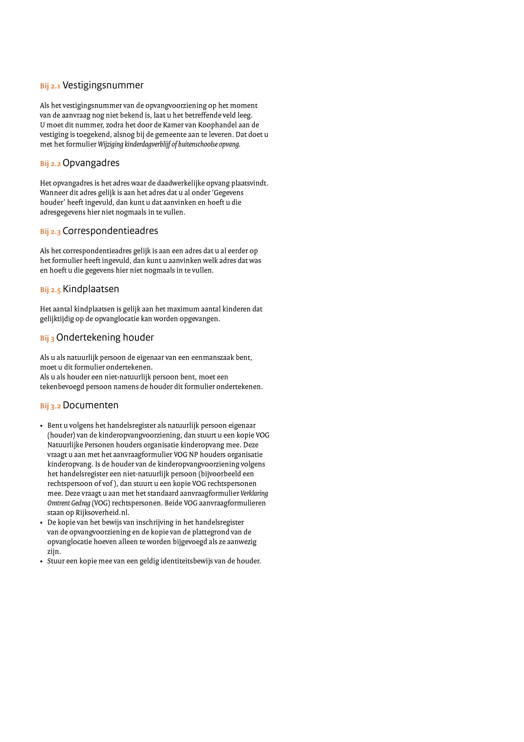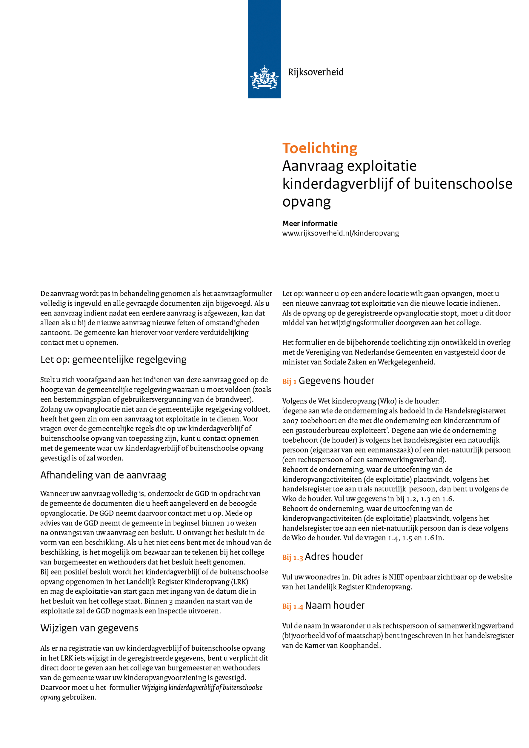 Ook in de aanvraagformulieren voor de exploitatie van een kinderopvangvoorziening en de formulieren voor het wijzigen van gegevens zijn enige aanpassingen nodig. Op grond van artikel 5, vierde lid, van het Besluit landelijk register kinderopvang en register buitenlandse kinderopvang2, wordt de aanvraag, bedoeld in artikel 1.45, eerste en tweede lid, van de Wet kinderopvang (dat wil zeggen de aanvraag tot exploitatie van een kindercentrum, een gastouderbureau of een voorziening voor gastouderopvang) ingediend met gebruikmaking van het formulier dat ter zake door de Minister van Sociale Zaken en Werkgelegenheid wordt vastgesteld. Artikel 7, vijfde lid, van het Besluit landelijk register kinderopvang en register buitenlandse kinderopvang bepaalt dat ook voor een verzoek als bedoeld in artikel 1.47, eerste lid, van de Wet kinderopvang (dat wil zeggen een verzoek tot wijziging van gegevens) gebruik dient te worden gemaakt van het daarvoor door de Minister van Sociale Zaken en Werkgelegenheid vastgestelde formulier. De aanvraag- en wijzigingsformulieren zijn gepubliceerd op www.rijksoverheid.nl/kinderopvang. Met de onderhavige bekendmaking worden de op www.rijksoverheid.nl/kinderopvang gepubliceerde aanvraag- en wijzigingsformulieren vervangen door de in de bijlagen bij deze bekendmaking opgenomen formulieren, die ook in de Staatscourant worden geplaatst. Met artikel 1 van deze bekendmaking vervallen het aanvraagformulier voor exploitatie van een peuterspeelzaal en het formulier voor het doorgeven van wijzigingen aan de gemeente door een houder van een peuterspeelzaal.