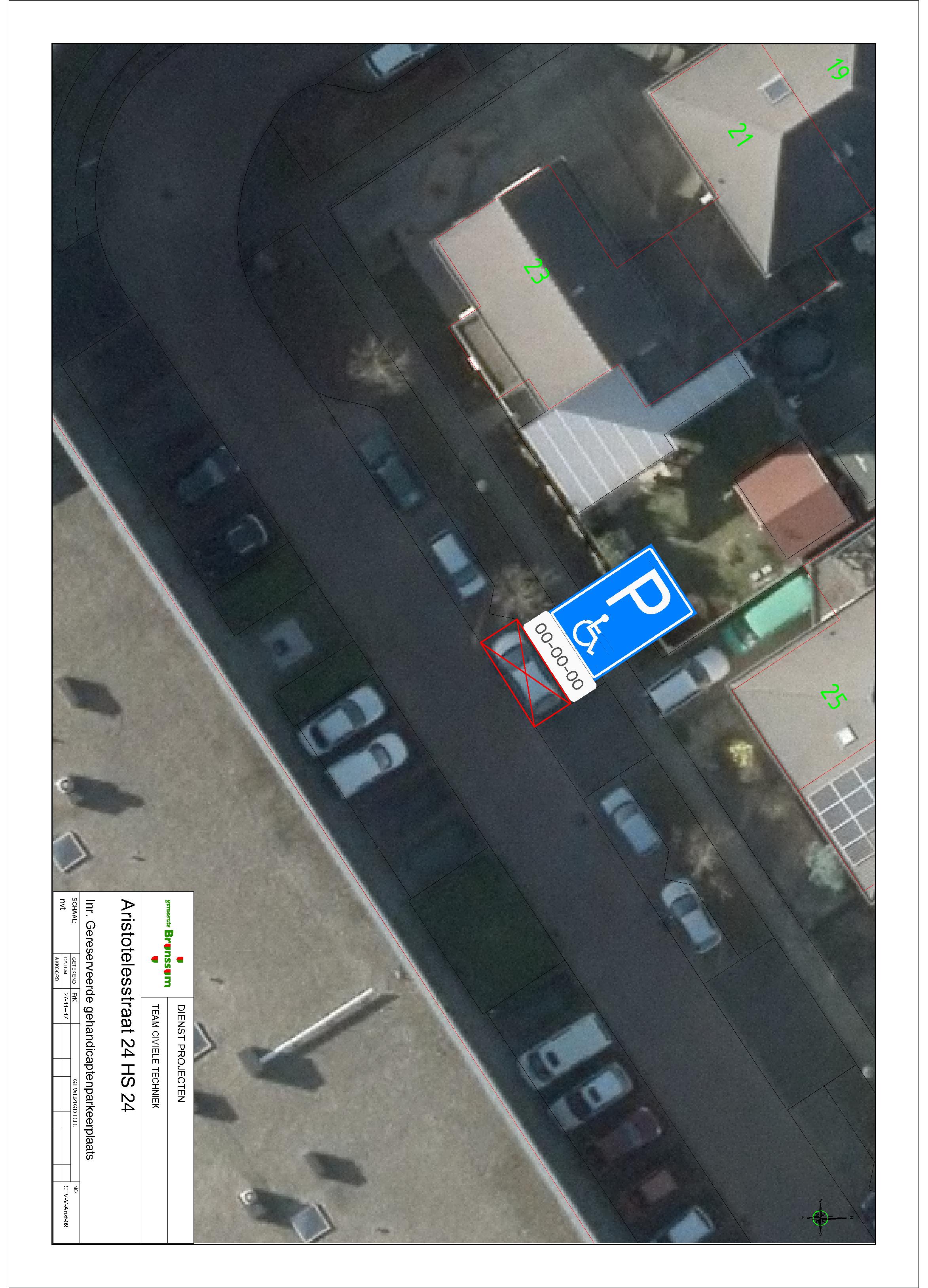 De gemeente heeft een verzoek ontvangen voor het aanwijzen en inrichten van een gehandicaptenparkeerplaats op kenteken nabij Aristotelesstraat 24 HS 24 (gelegen in de parkeerhaven voor de zijgevel van het pand Aristotelesstraat 23).