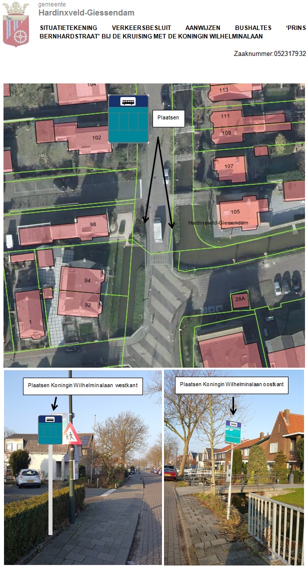 1. door plaatsing van de verkeersborden model L3 van bijlage 1 van het RVV 1990 twee bushaltes ‘Prins Bernhardstraat’ aan te wijzen, aan beide zijden van de Koningin Wilhelminalaan ter hoogte van huisnummer 105, bij de kruising met de Prins Bernhardstraat, conform de bij dit besluit behorende situatietekening;