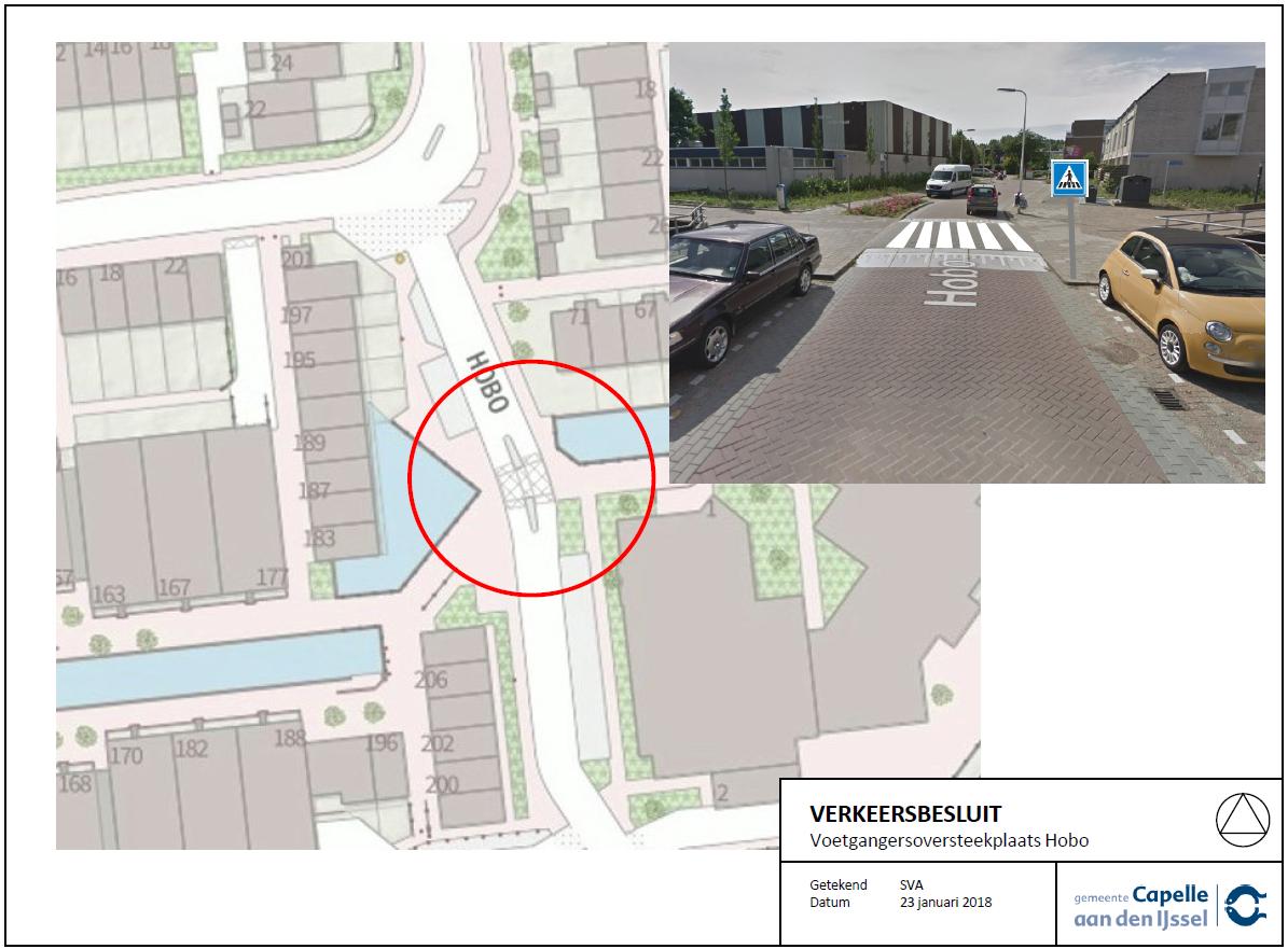 Door het plaatsen van verkeersborden L2 van Bijlage I van het Reglement Verkeersregels en Verkeerstekens 1990 en het aanbrengen van zebramarkering, op de Hobo ter hoogte van de aansluitingen met de Floris Burgwal en de Gong, een voetgangersoversteekplaats als bedoeld in artikel 49 van het Reglement Verkeersregels en Verkeerstekens 1990 vast te stellen;