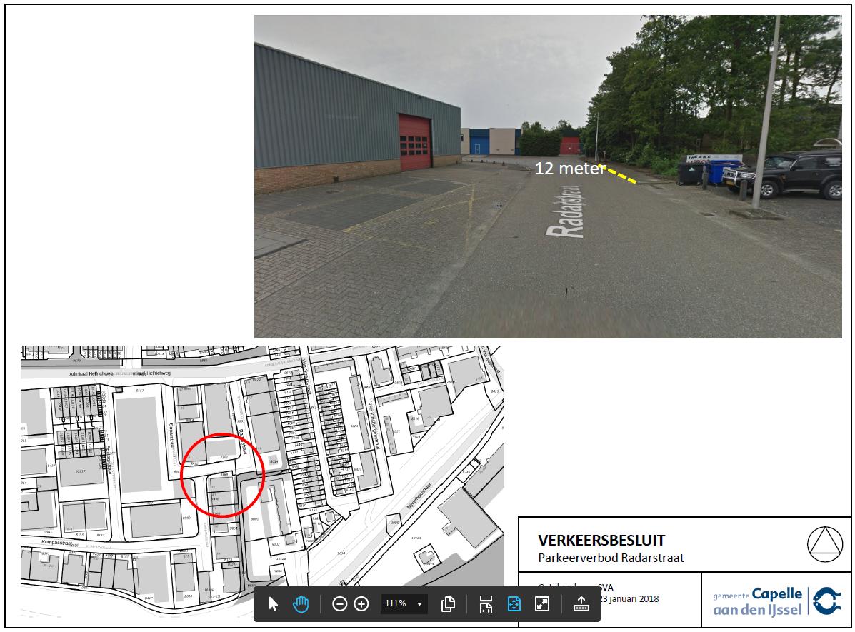 Uit oogpunt van het waarborgen van de bruikbaarheid van de weg is het gewenst op de Radarstraat tegenover de meest oostelijke roldeur over een lengte van 8 meter een parkeerverbod in te stellen.