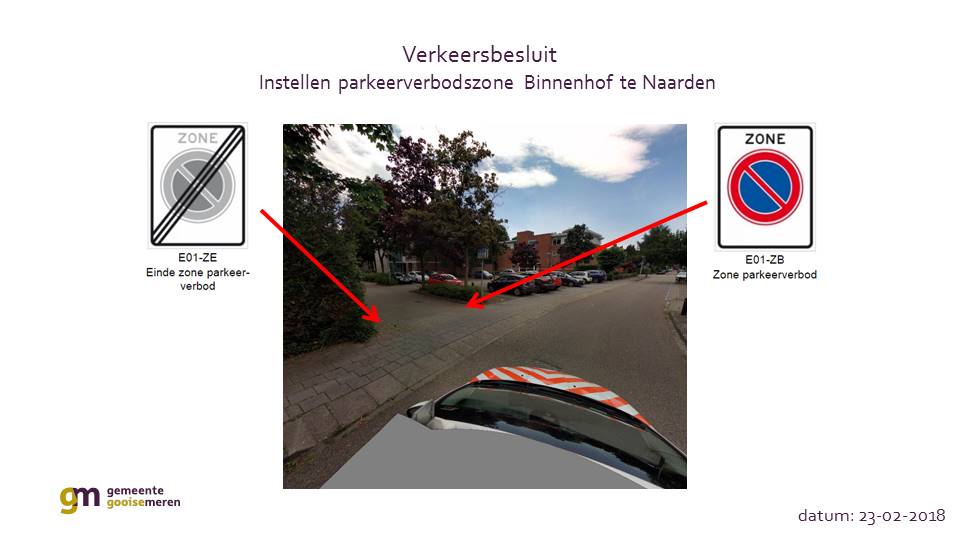 Op grond van de overwegingen heeft het college van burgemeester en wethouders besloten om op de Binnenhof te Naarden aan de westzijde een parkeerverbodszone in te stellen door het plaatsen van de borden E1 (ZB en ZE) zoals opgenomen in bijlage I van het RVV1990.