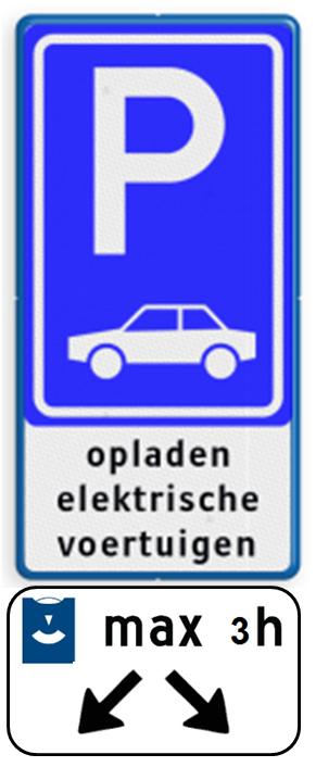 Bij de parkeerplaats wordt een verkeersbord E08 (opladen elektrische auto’s) geplaatst en wordt de blauwe streep aangebracht.