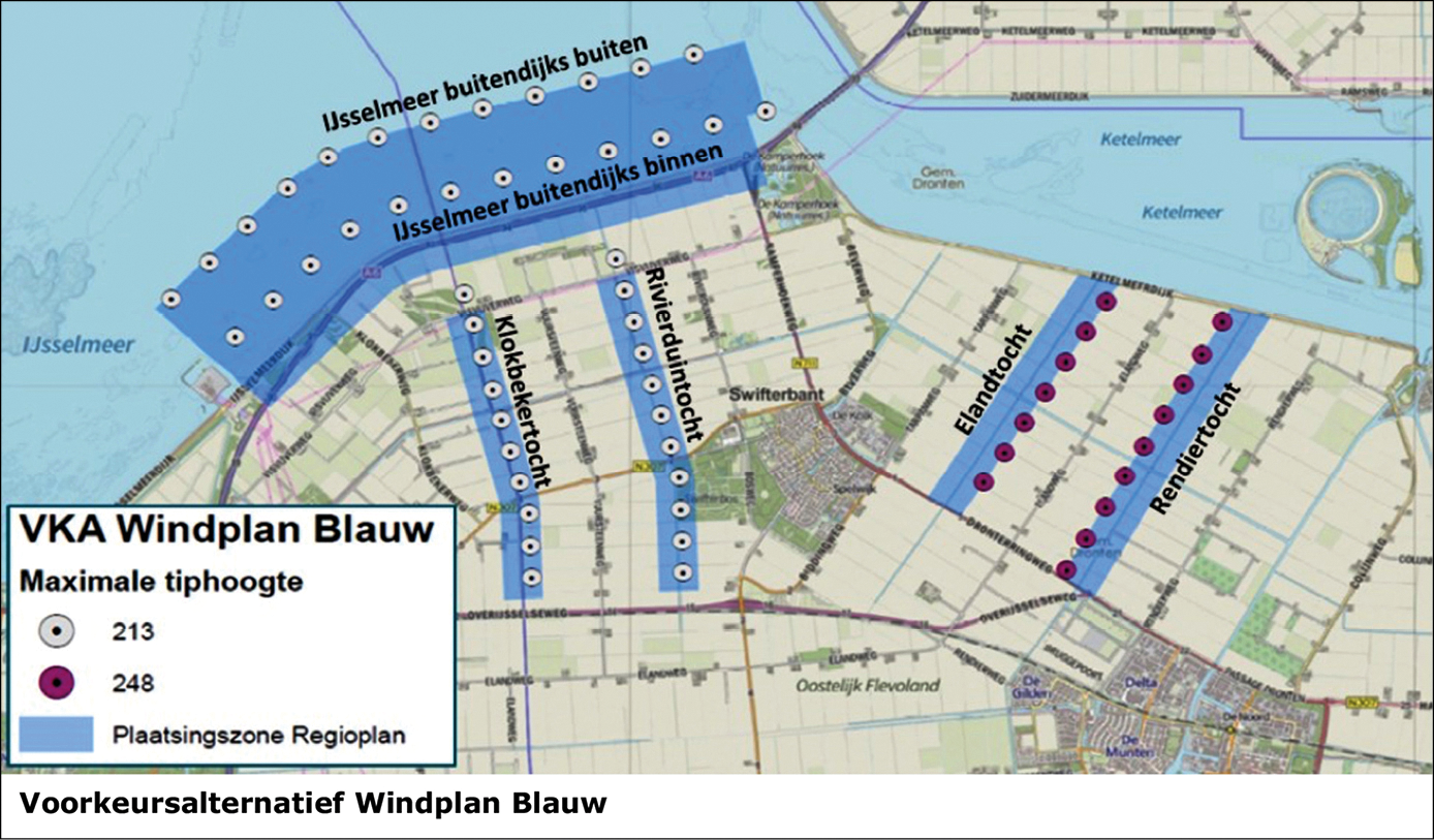 Nuon en windvereniging SwifterwinT werken samen onder de naam Windplan Blauw aan de ontwikkeling van een windpark in de noordwesthoek van Flevoland, in de gemeenten Dronten en Lelystad. Met de komst van het windpark worden de 74 huidige windmolens in de polder vervangen door 61 (grotere) windmolens met meer vermogen. Deze wekken genoeg stroom op voor het totale elektriciteitsverbruik van ca. 125.000 Nederlanders. Met deze strategie van ‘opschalen en saneren’ worden verschillende doelstellingen bereikt: een duurzamere energiehuishouding, een mooier landschap en een sterkere economie. Inwoners van de gemeenten Dronten en Lelystad hebben de mogelijkheid tot financiële participatie in het windpark, zodat zij mee kunnen profiteren van hernieuwbare energie.