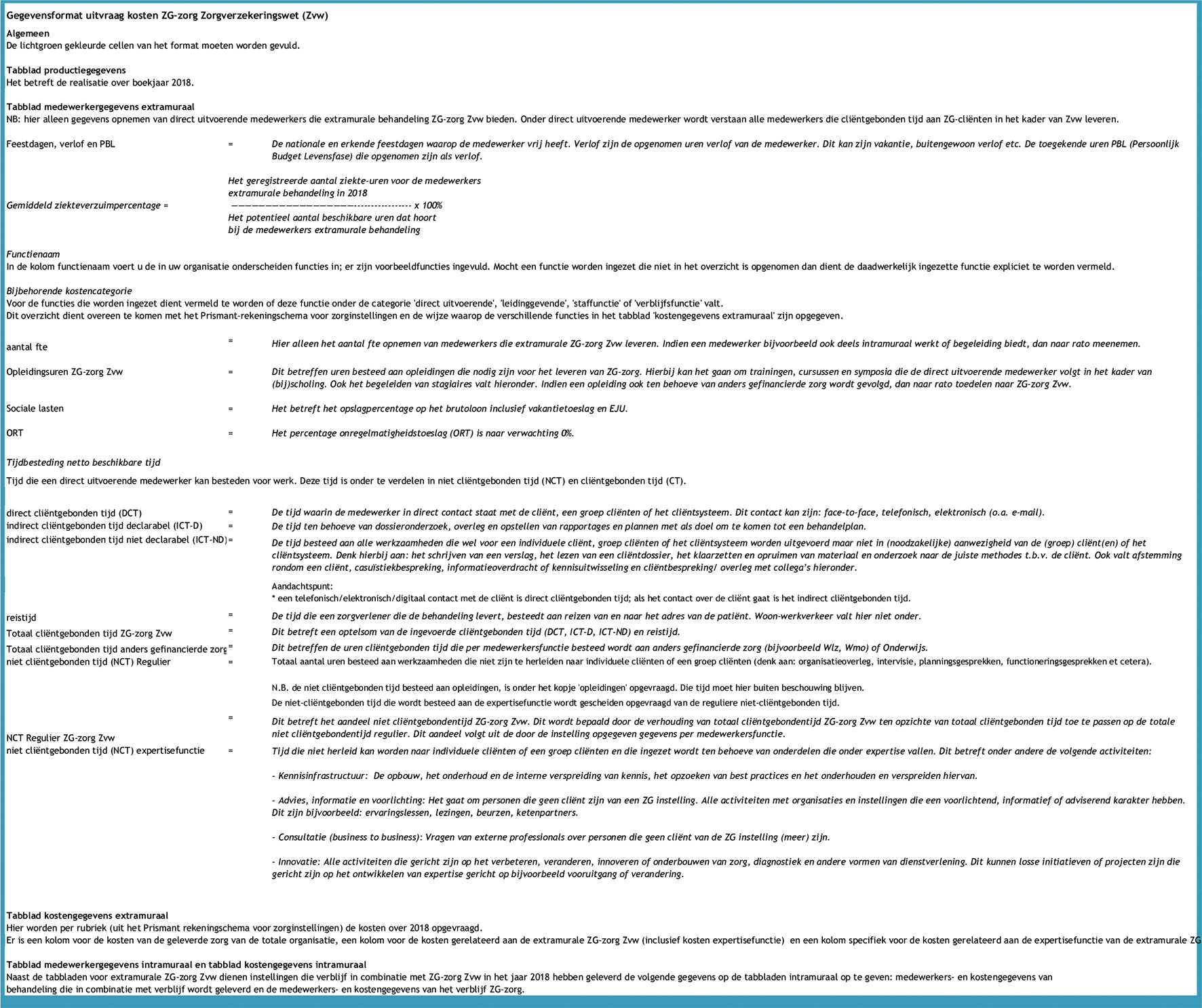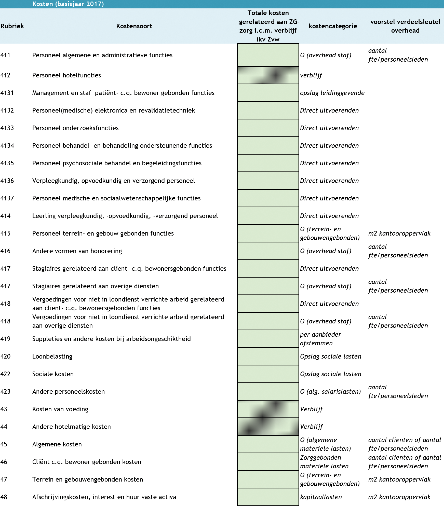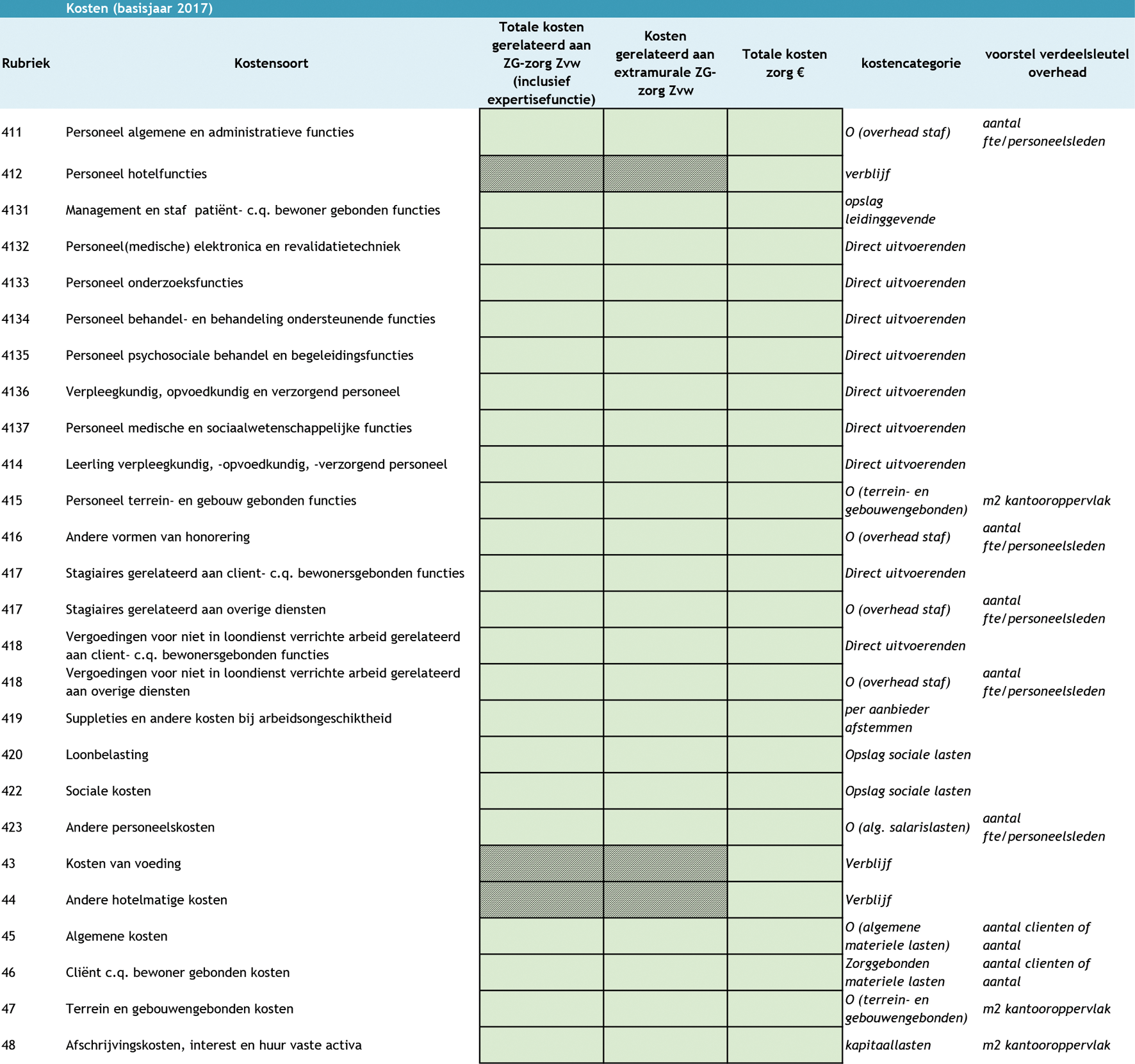 De zorgaanbieder vult het door de NZa beschikbaar gestelde formulier (bijlage 3 bij NR/REG-1808a ‘Aanleverformulier kostengegevens ZG-zorg 2017’) in, overeenkomstig met de aanwijzingen als gegeven n het formulier.