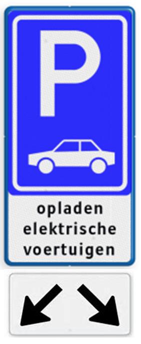 Bij de parkeerplaats wordt een verkeersbord E08 (opladen elektrische auto’s) geplaatst en wordt de blauwe streep aangebracht.