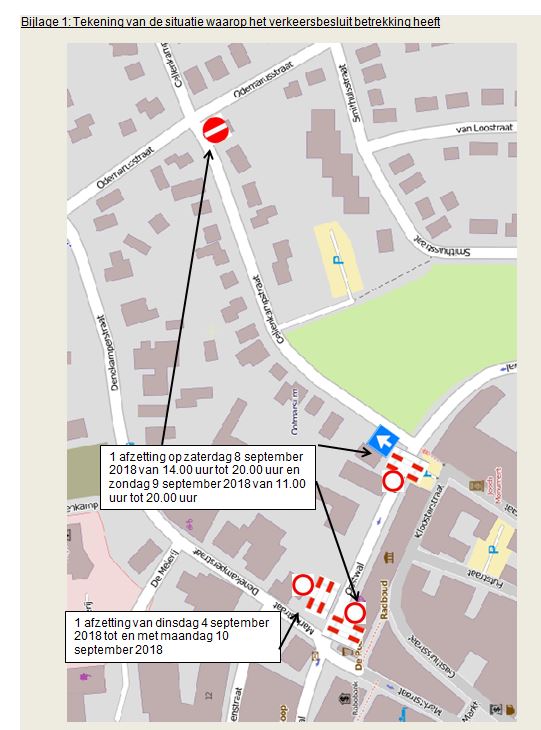 a.Op zaterdag 8 september 2018 van 14.00 uur tot 20.00 uur en zondag 9 september 2018 van 11.00 uur tot 20.00 uur de Cellenkampstraat, voor zover gelegen tussen de Oostwal en de Odemarusstraat, zodanig dat slechts in noordoostelijke richting op dit wegvak mag worden gereden;