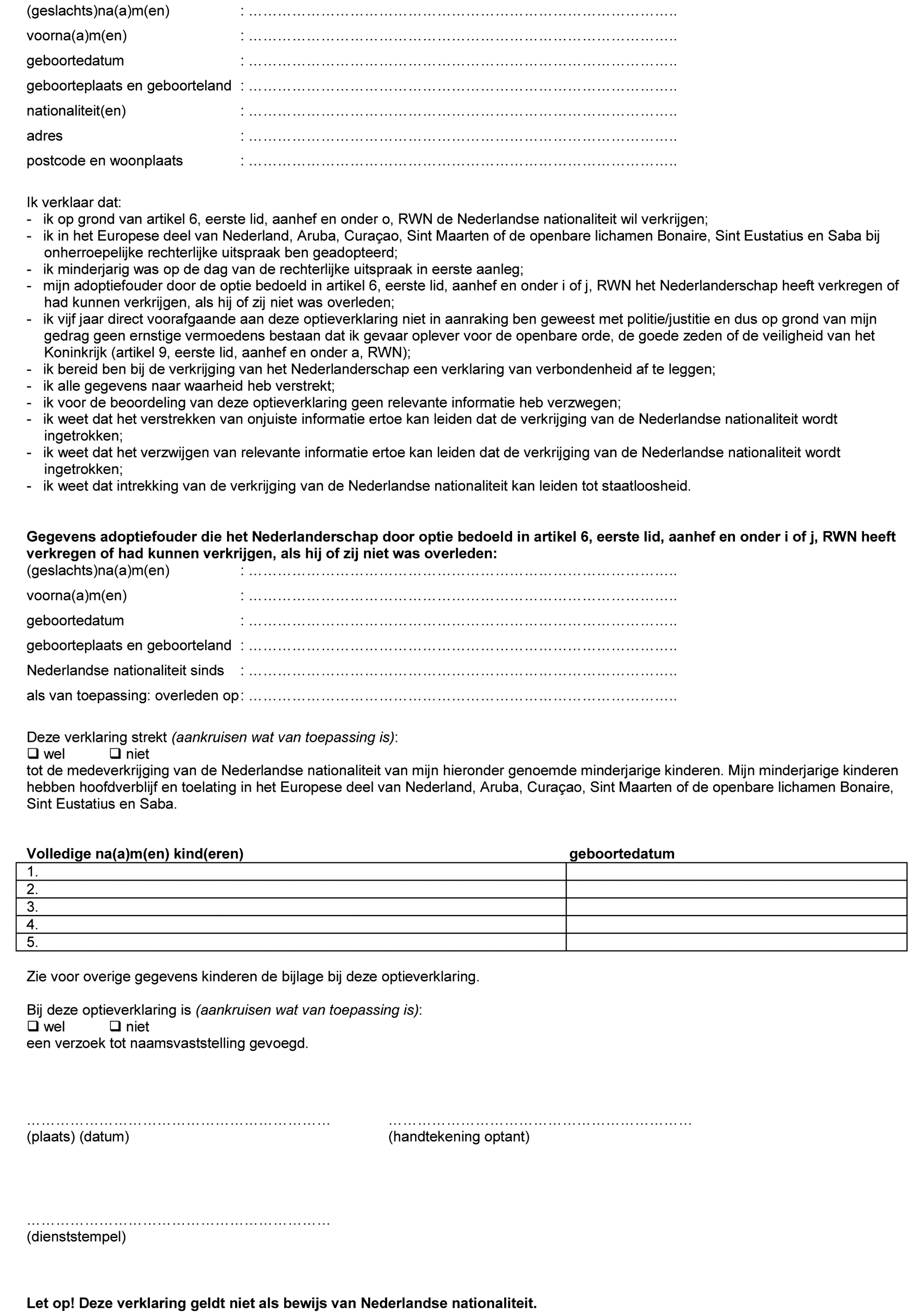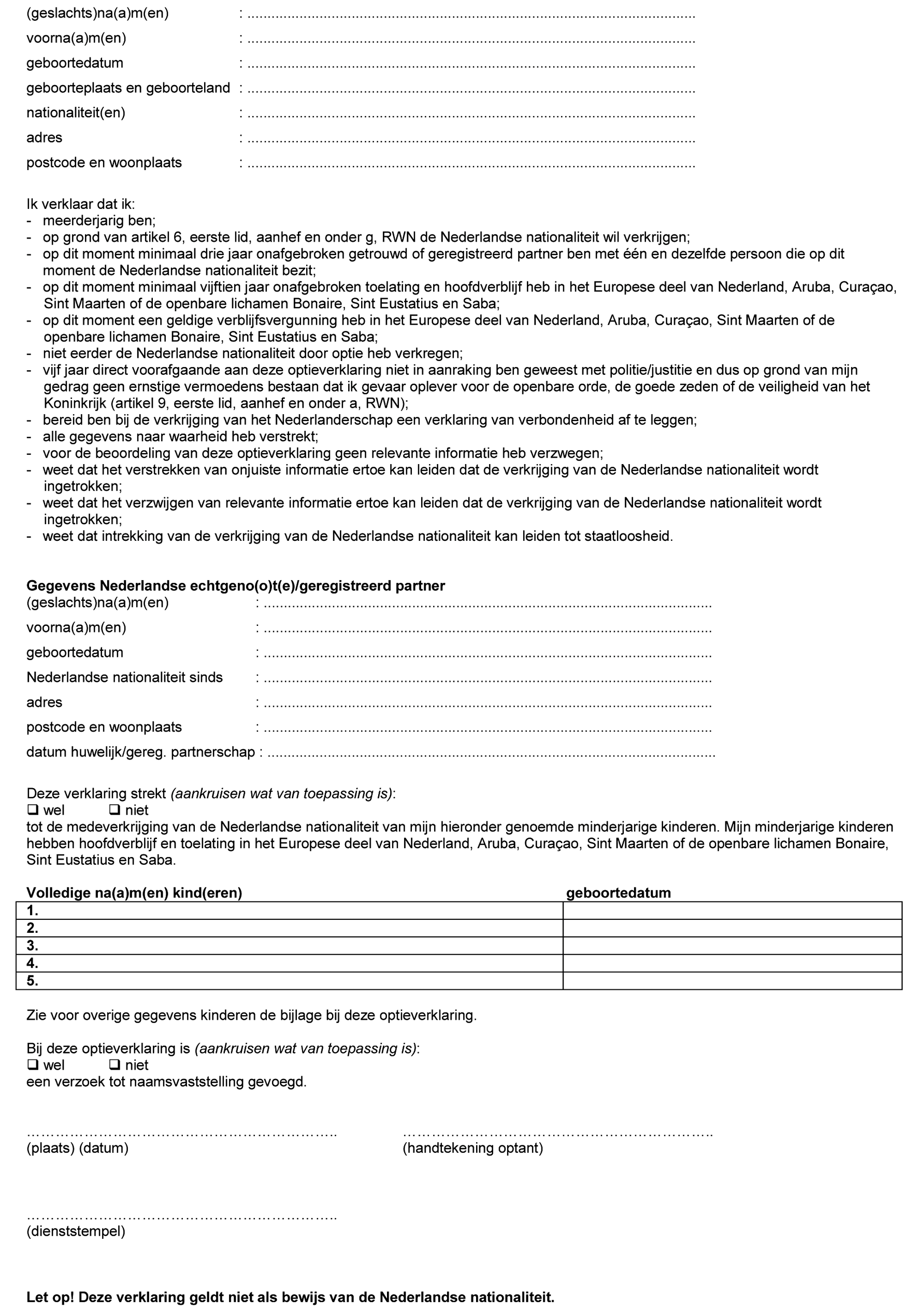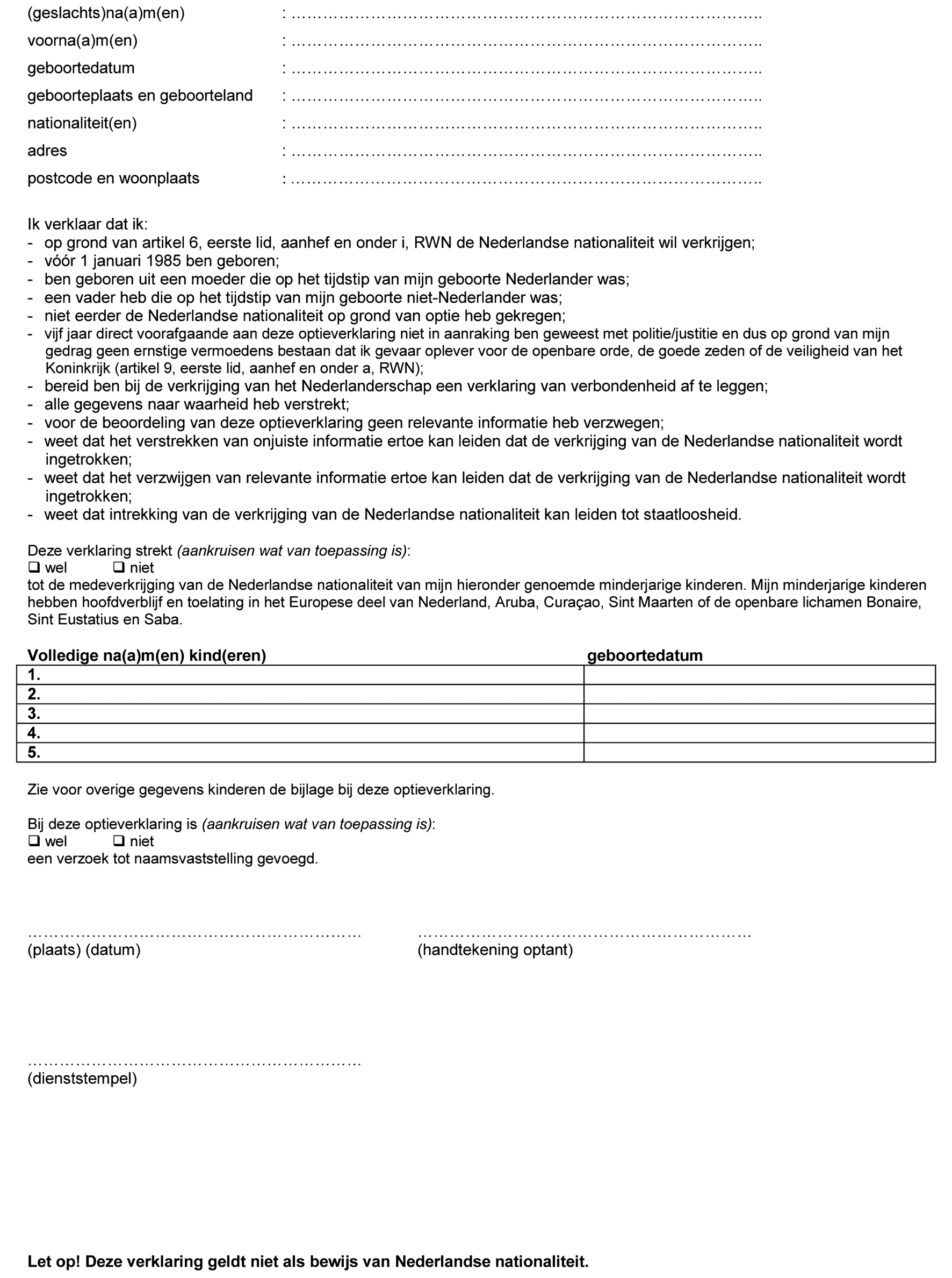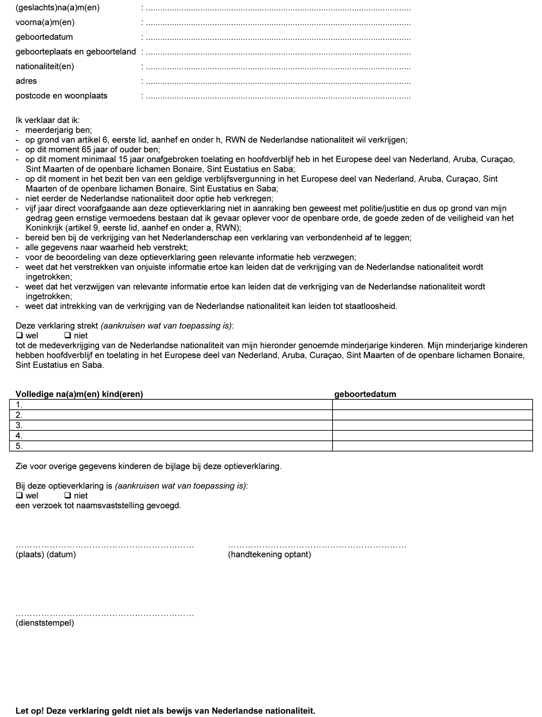 Model 1.9 HRWN-BES: Optieverklaring op grond van artikel 6, eerste lid, onder f, juncto artikel 26 van de Rijkswet op het Nederlanderschap, komt te luiden als aangegeven in bijlage 5.
