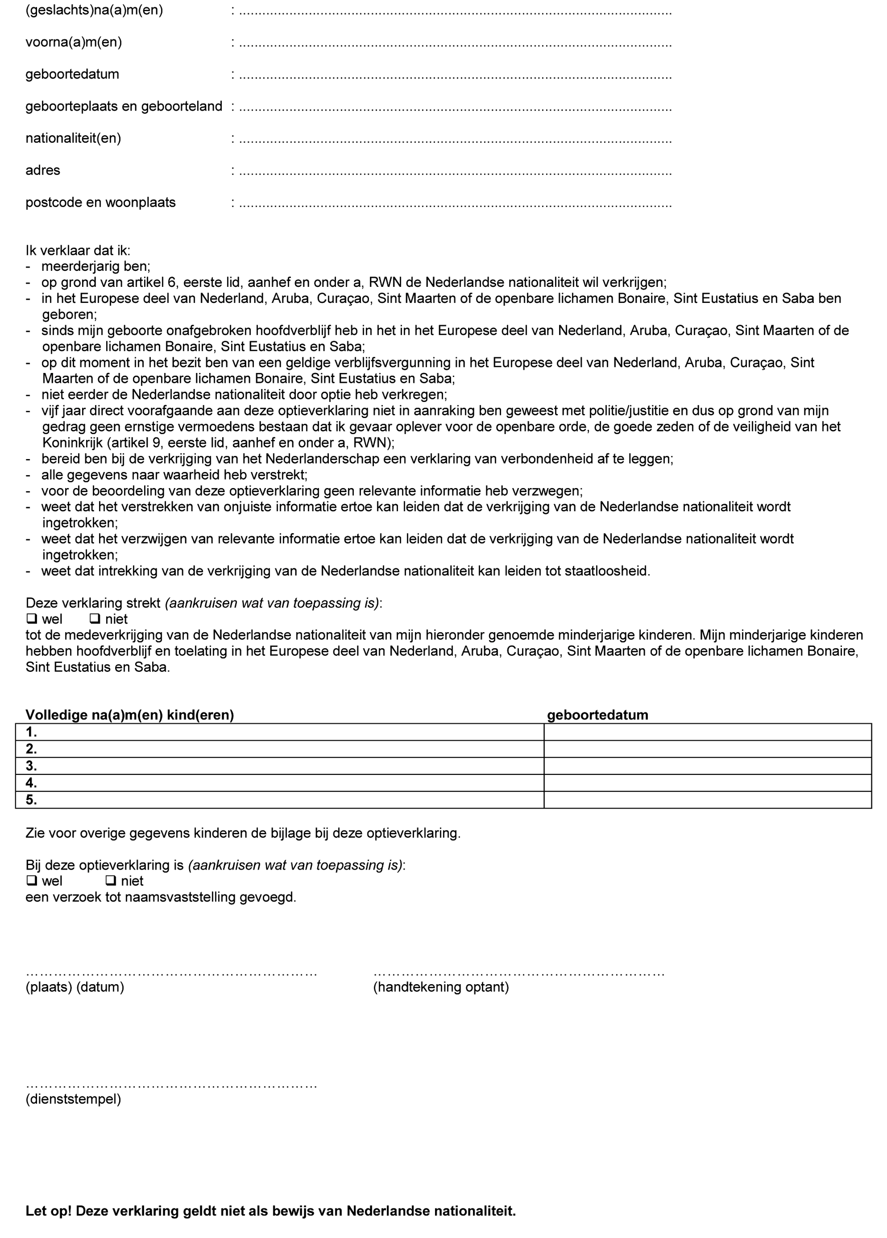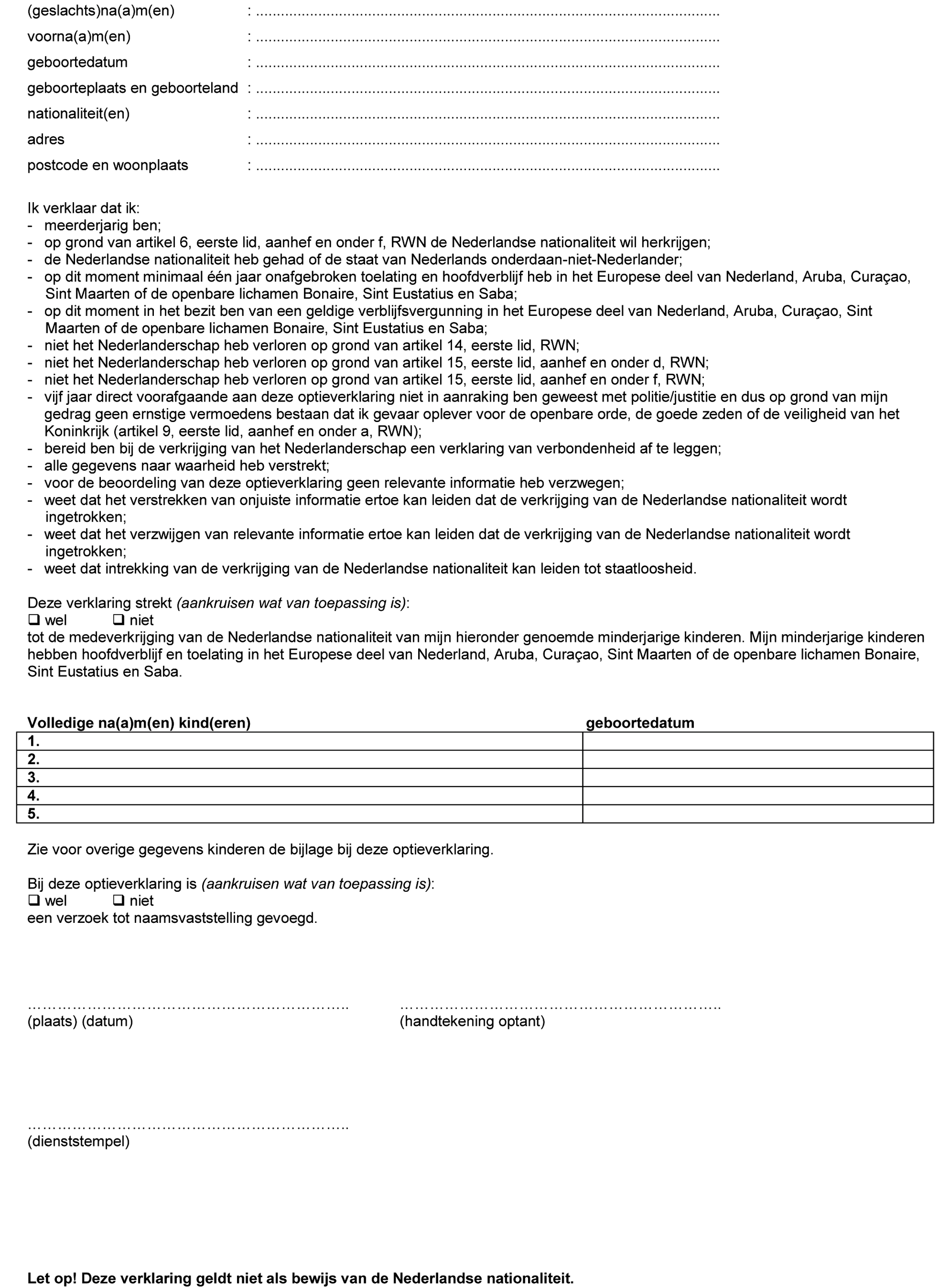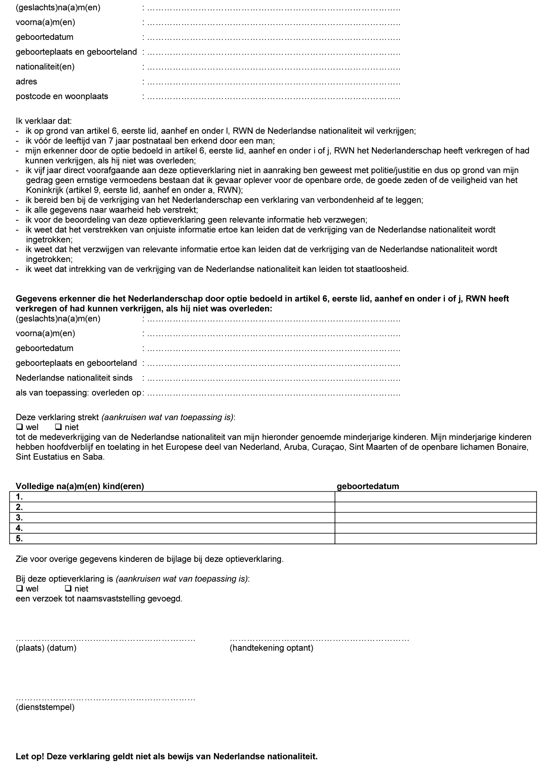 Model 1.9 HRWN-BES: Optieverklaring op grond van artikel 6, eerste lid, onder f, juncto artikel 26 van de Rijkswet op het Nederlanderschap, komt te luiden als aangegeven in bijlage 5.
