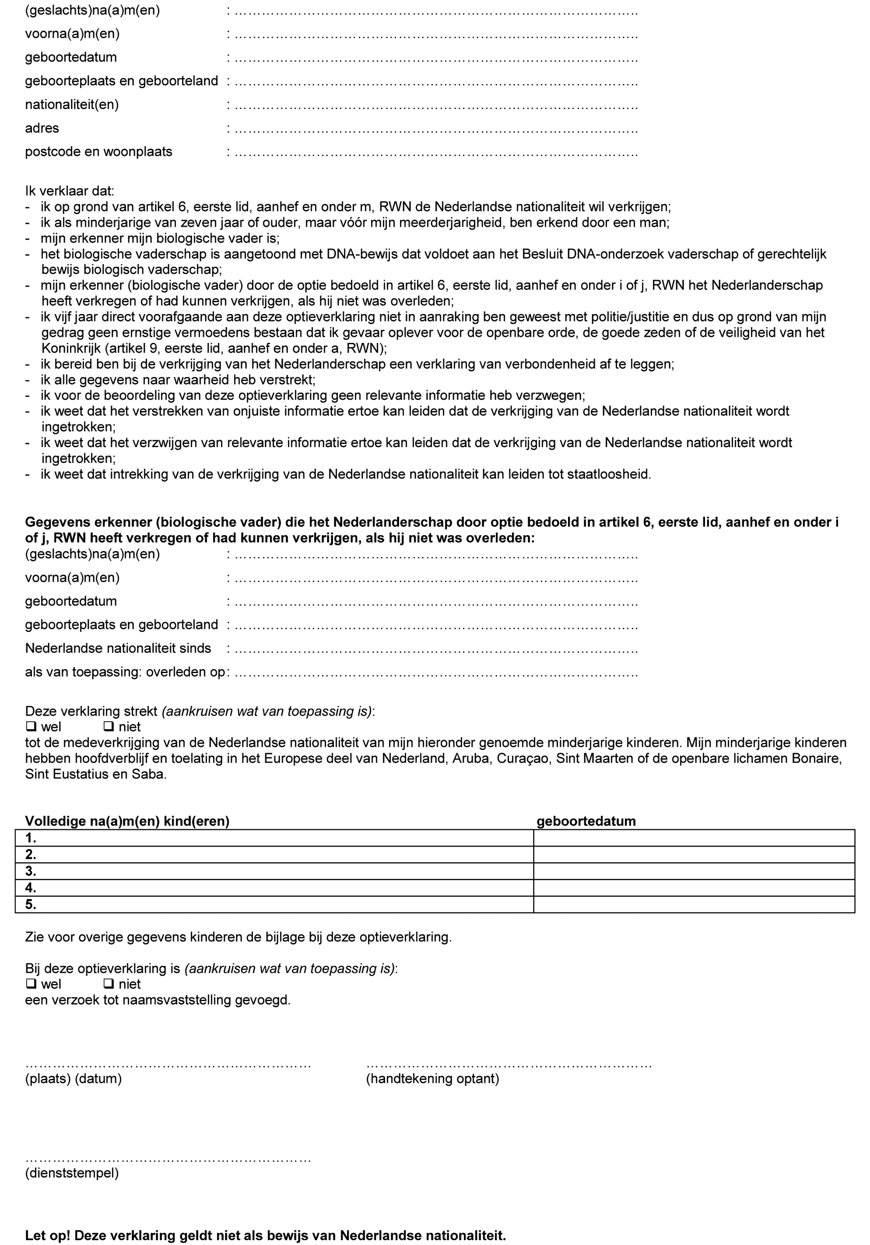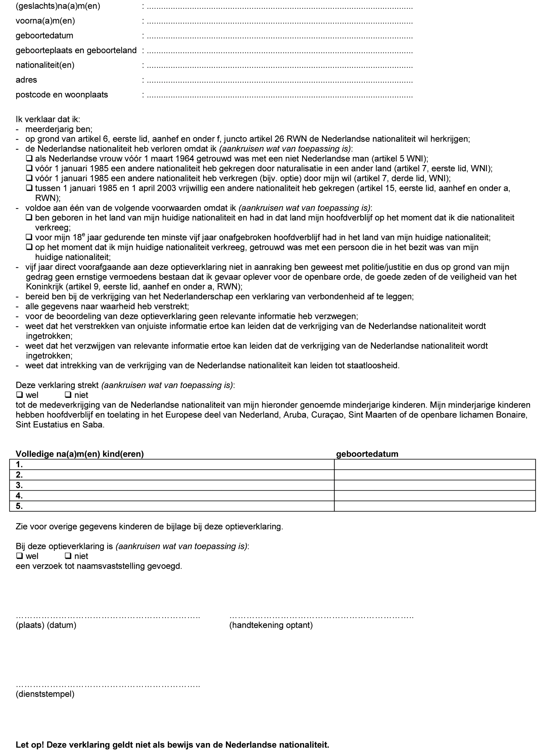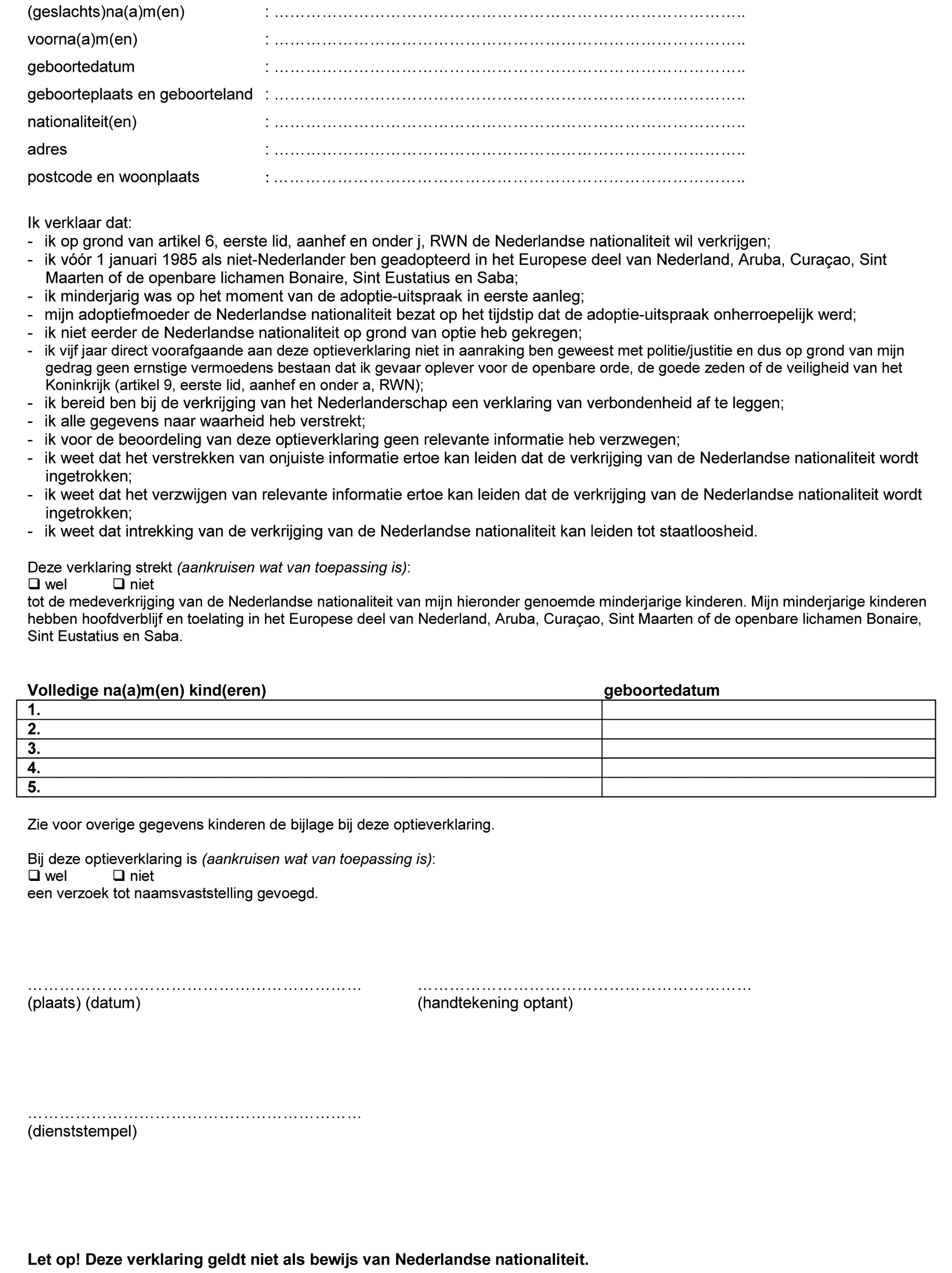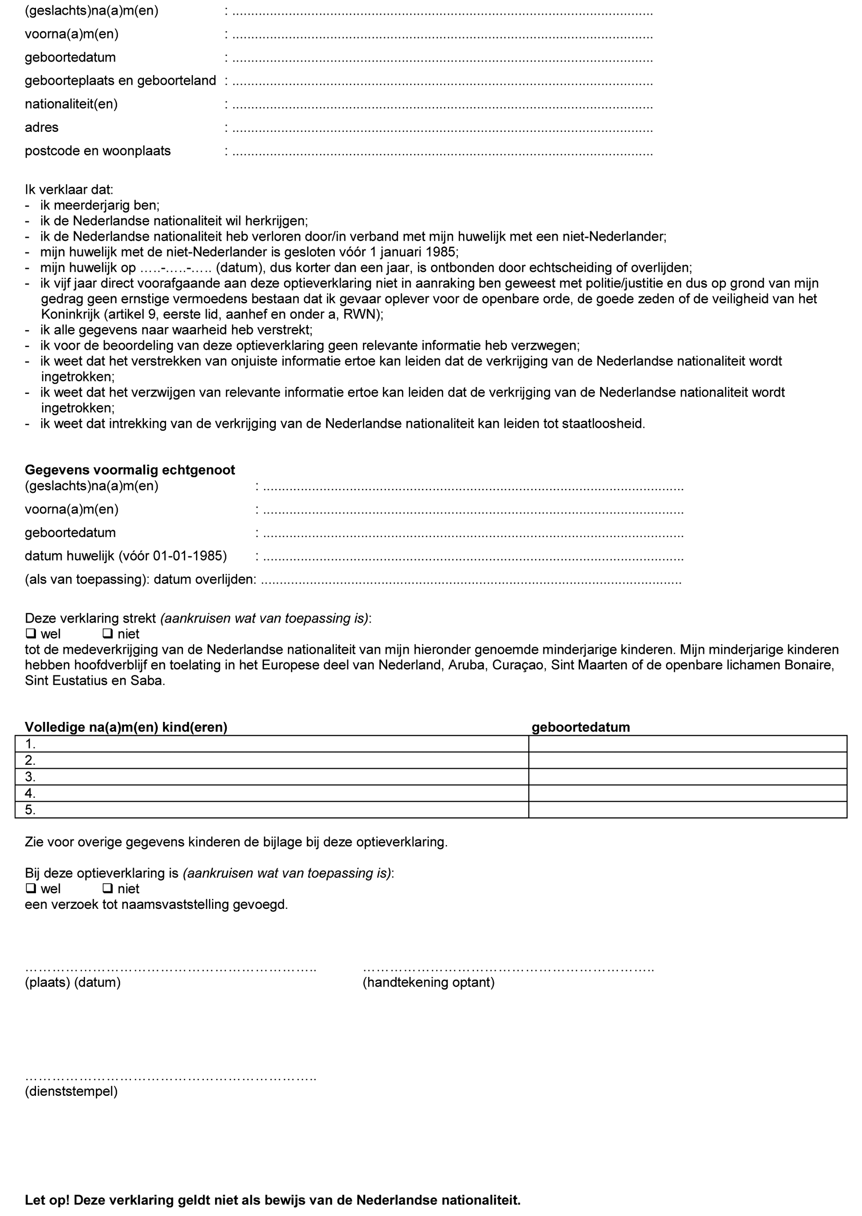Model 1.9 HRWN-BES: Optieverklaring op grond van artikel 6, eerste lid, onder f, juncto artikel 26 van de Rijkswet op het Nederlanderschap, komt te luiden als aangegeven in bijlage 5.