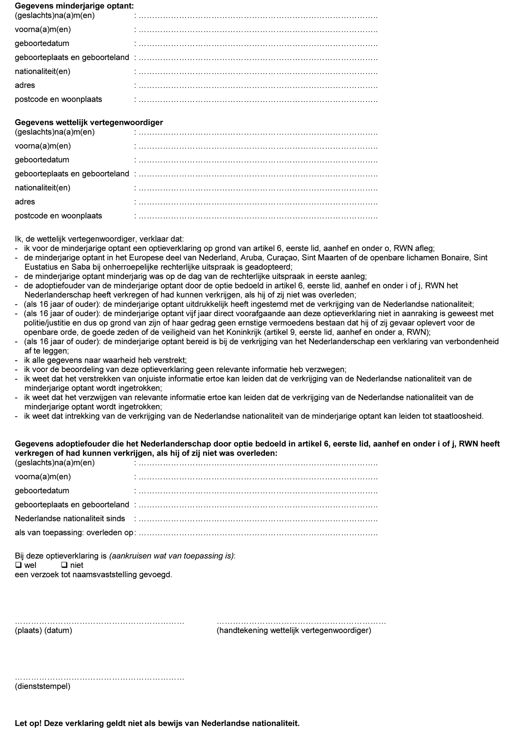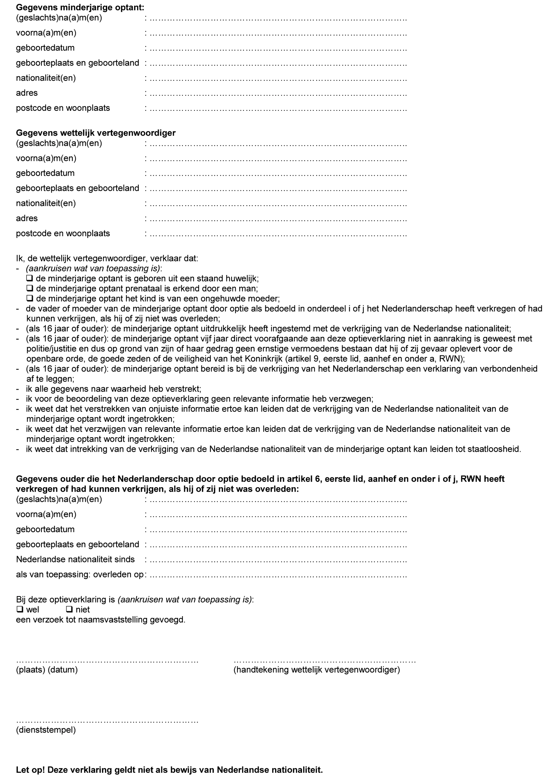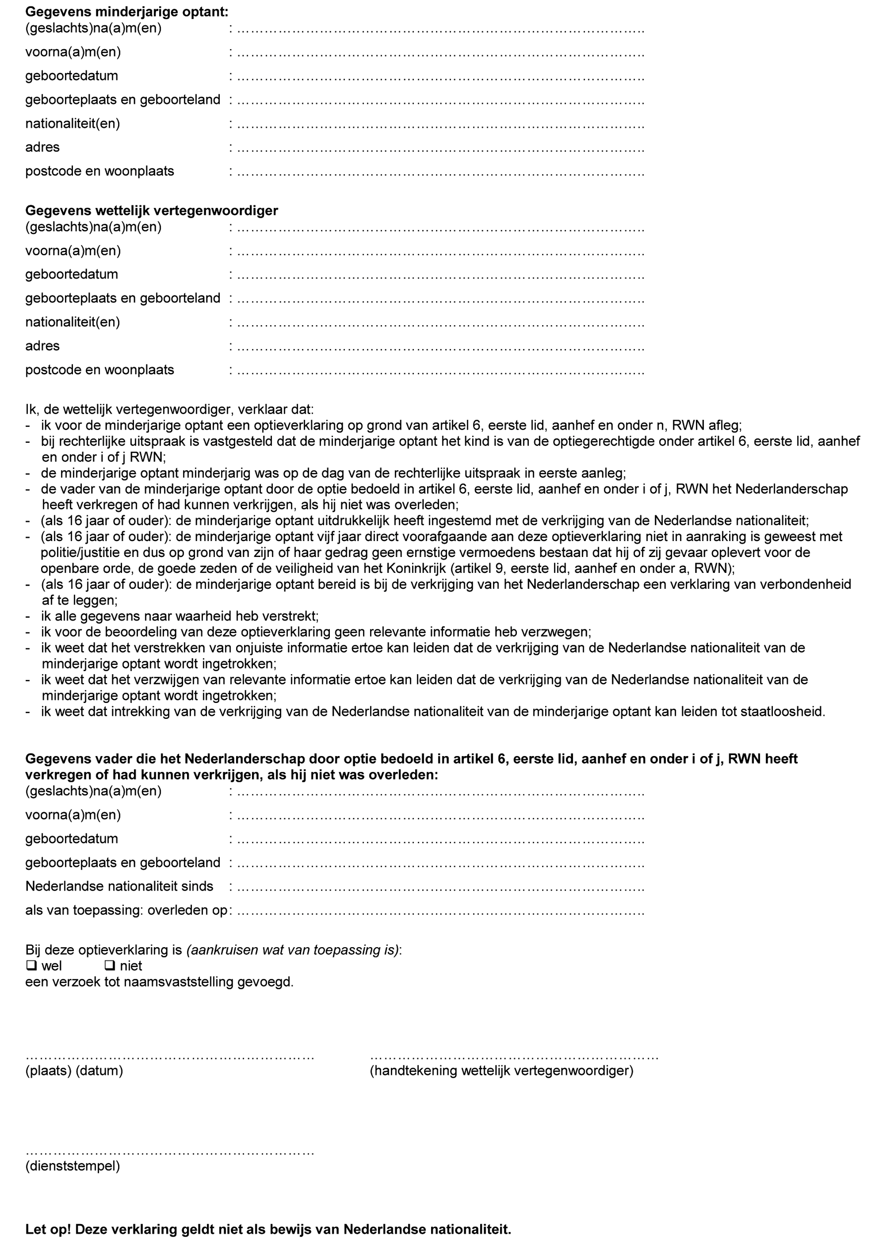 Model 1.6 HRWN-BES: Optieverklaring op grond van artikel 6, eerste lid, aanhef en onder d, RWN (afgelegd door wettelijk vertegenwoordiger) komt te luiden als aangegeven in bijlage 2.