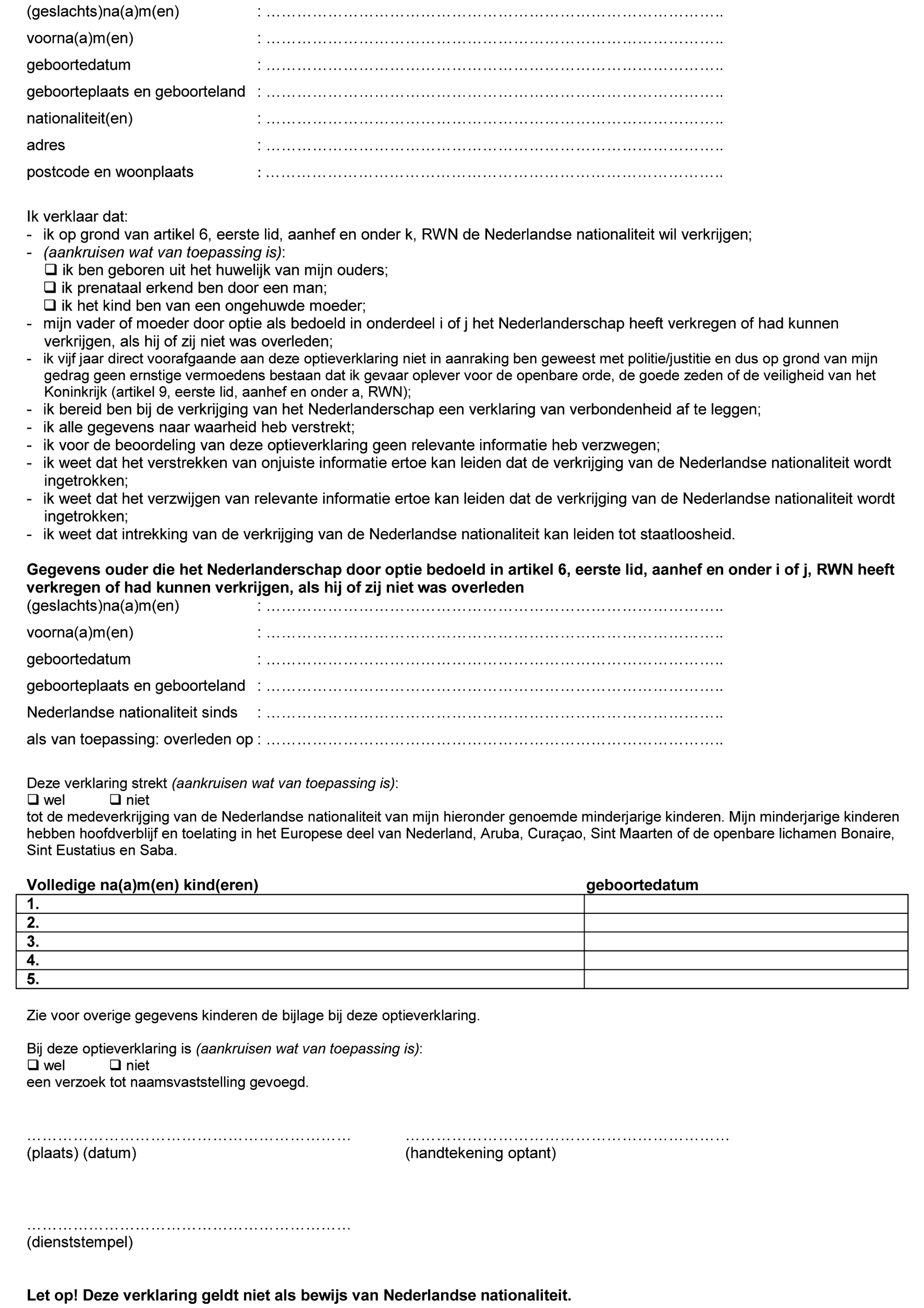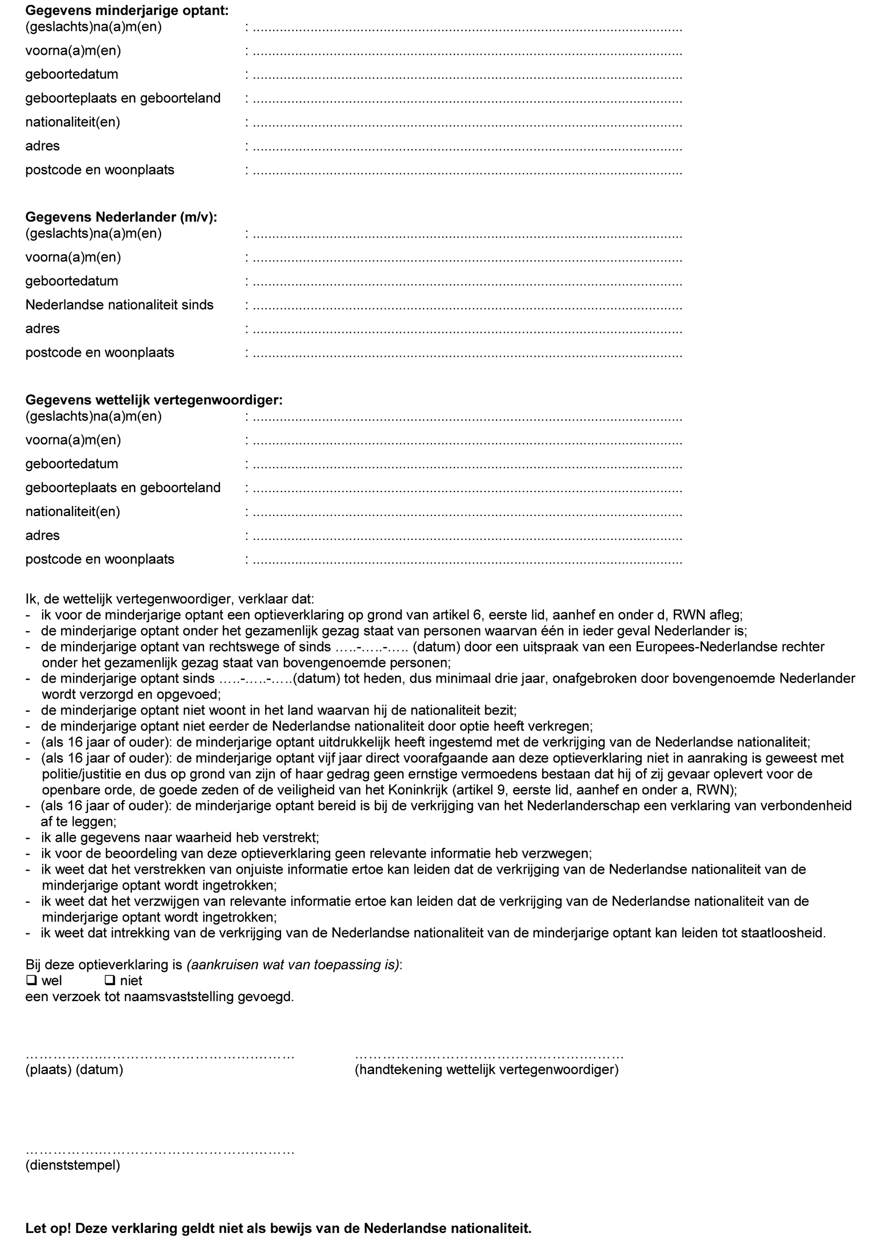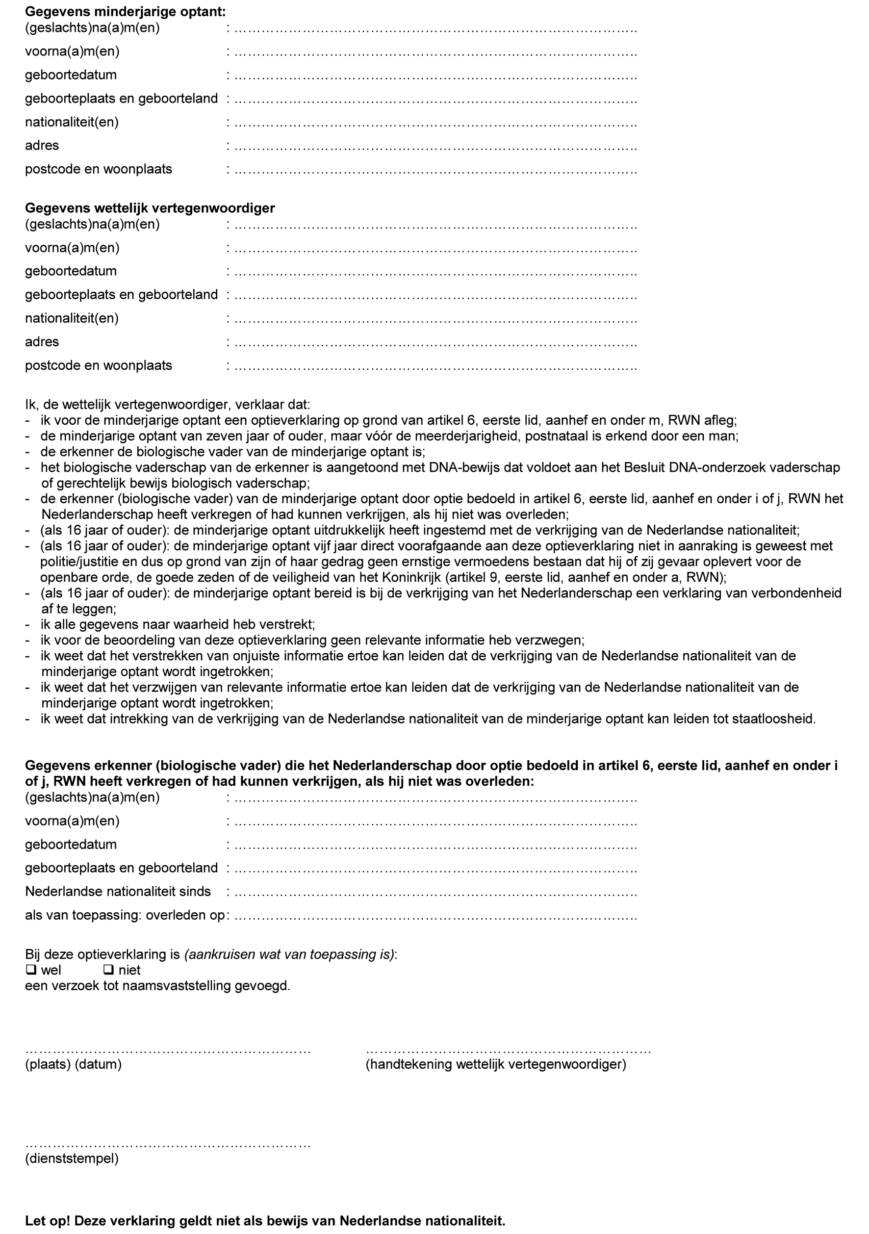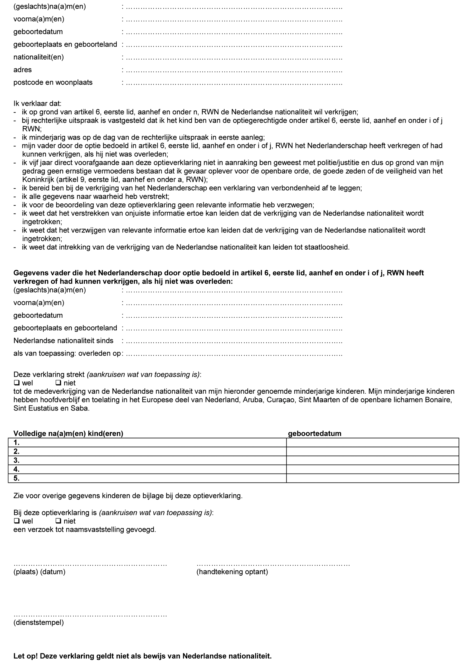 Model 1.6 HRWN-BES: Optieverklaring op grond van artikel 6, eerste lid, aanhef en onder d, RWN (afgelegd door wettelijk vertegenwoordiger) komt te luiden als aangegeven in bijlage 2.