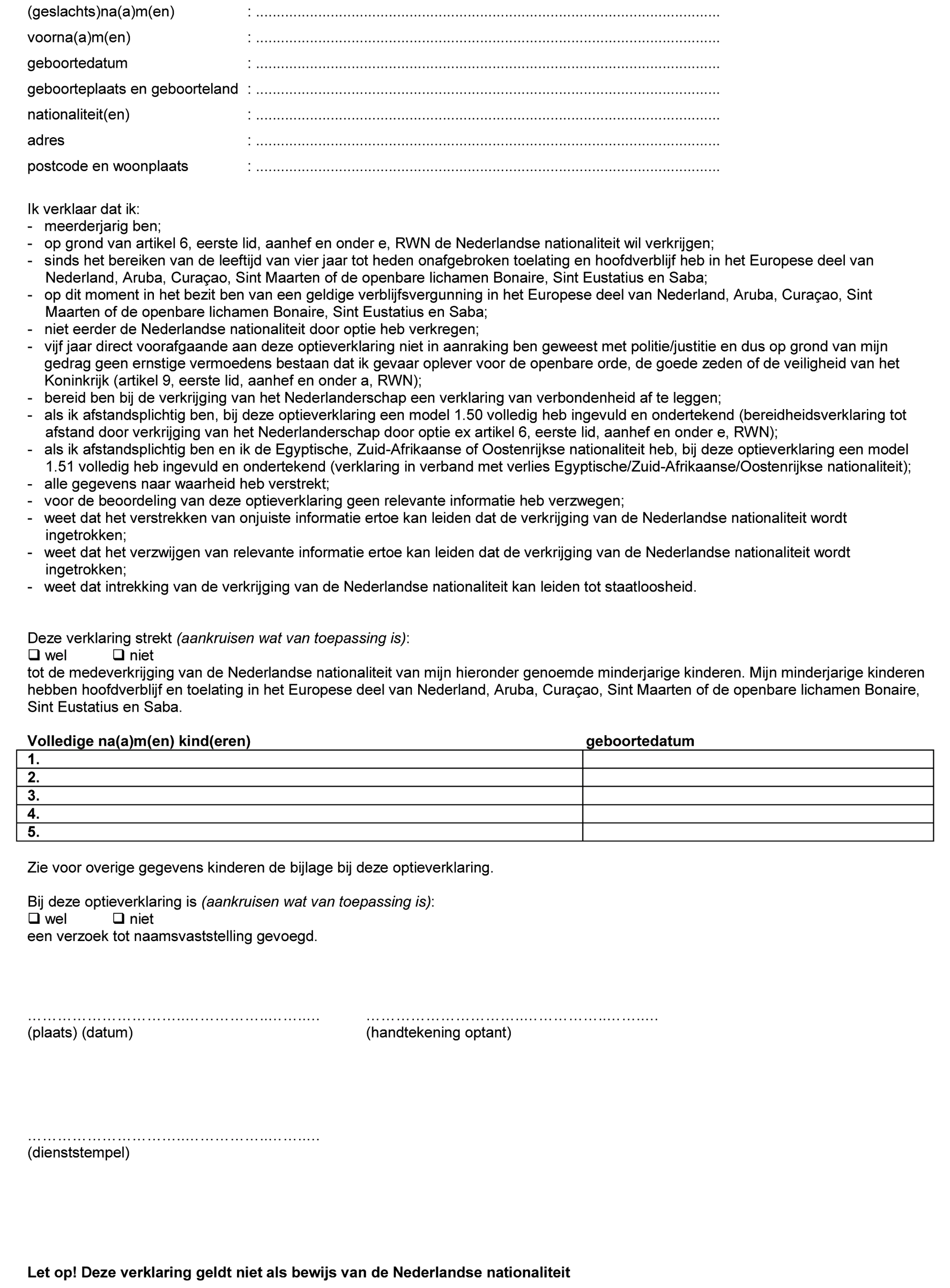 Model 1.49 HRWN-BES: Optieverklaring minderjarige op grond van artikel 6, eerste lid, aanhef en onder o, RWN (afgelegd door wettelijk vertegenwoordiger) komt te luiden als aangegeven in bijlage 21.