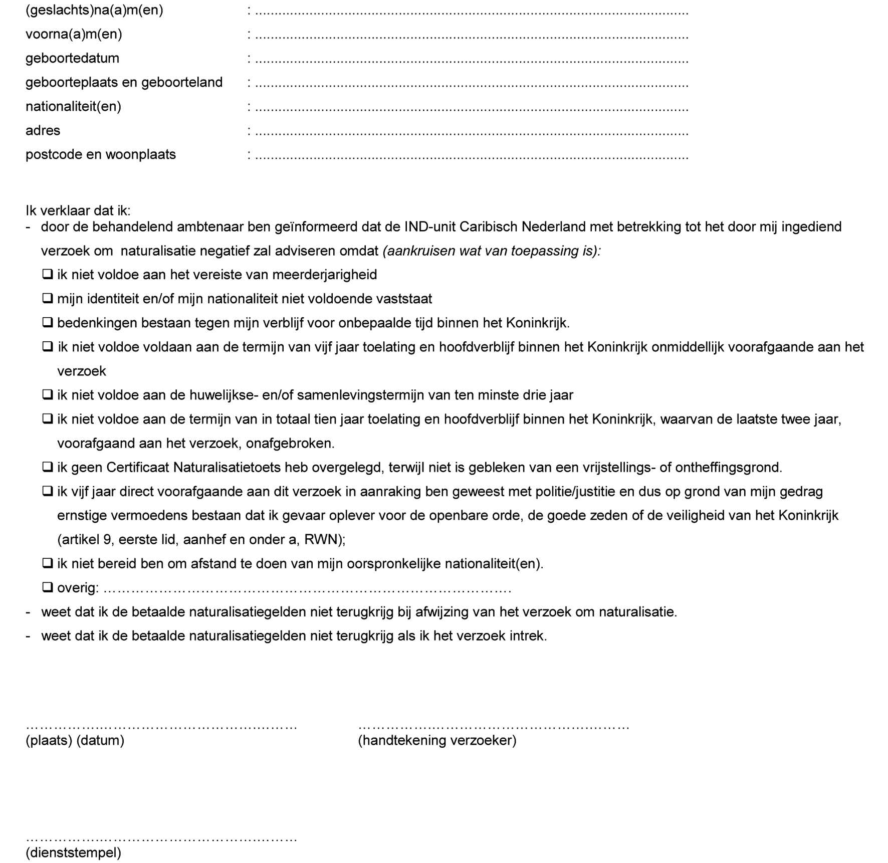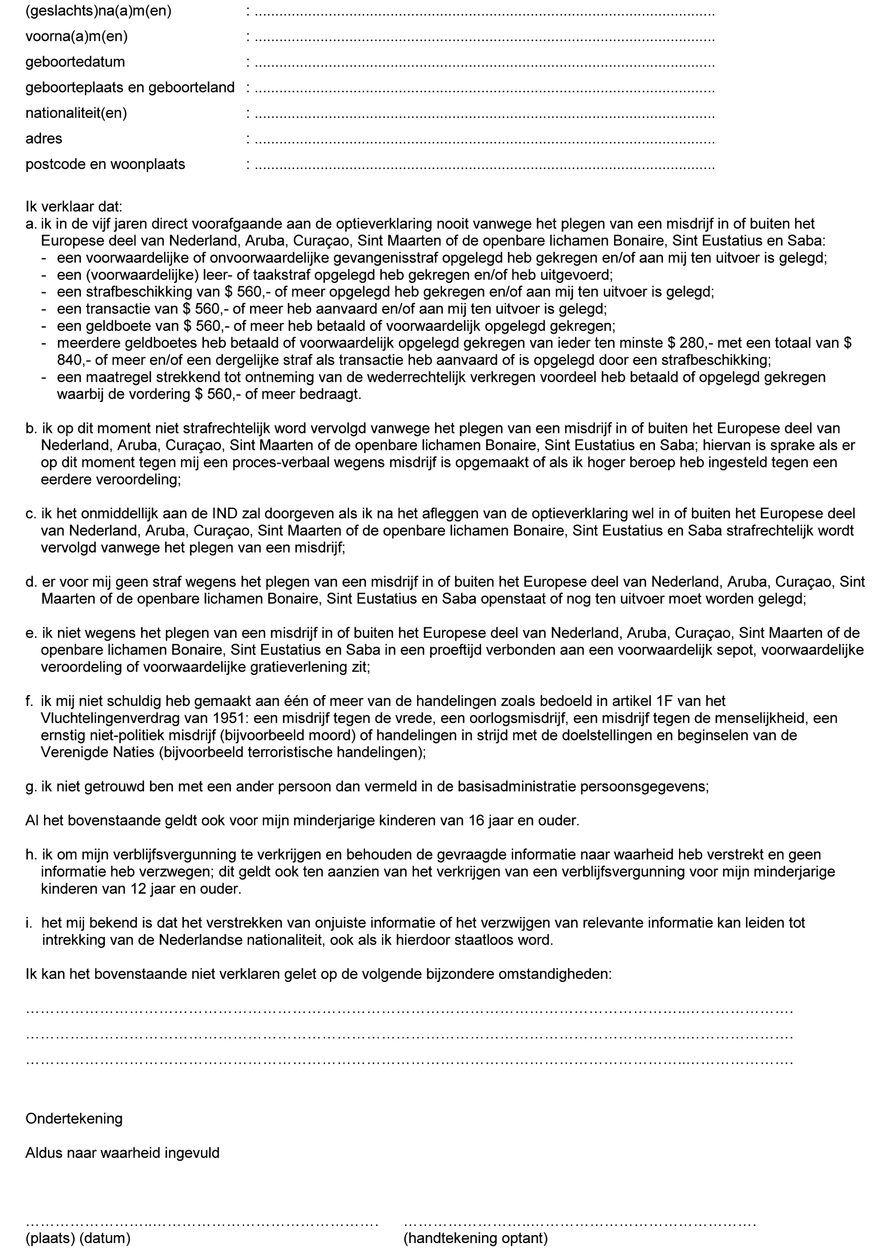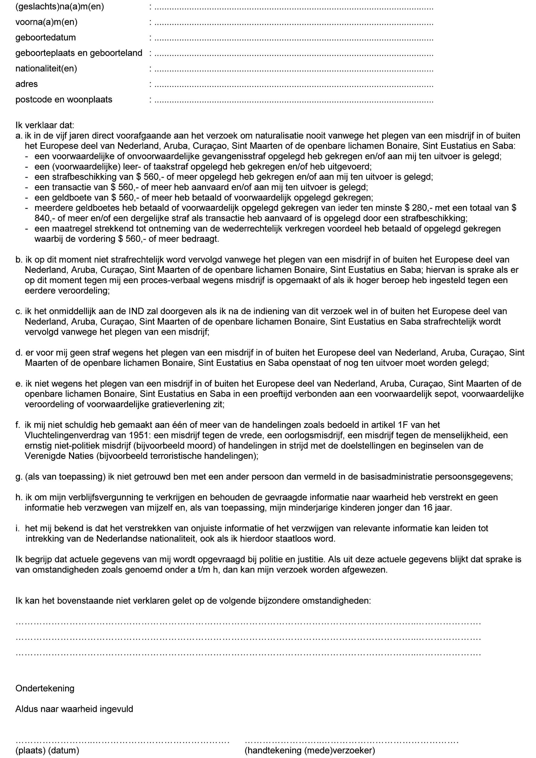 Iedere meerderjarige vreemdeling en iedere minderjarige kind van 16 jaar en ouder moet bij het verzoek om naturalisatie of optieverklaring een verklaring verblijf en gedrag (model 2.3 HRWN-BES bij naturalisatie, model 1.14 HRWN-BES bij optie) ondertekenen. In dit model verklaart hij dat hij niet in aanraking is geweest met politie en/of Justitie, én, als hij getrouwd is, dat hij niet met meer dan één vrouw is getrouwd. Het model bestaat uit meerdere verklaringen. Als de vreemdeling (of degene voor wie medenaturalisatie of medeoptie is verzocht) aangeeft dat hij niet een of meer van de verklaringen op voornoemde modelformulieren naar waarheid kan verklaren, dan moet hij op het model (zoveel mogelijk onderbouwd met stukken) aangeven waarom hij die verklaring niet kan afleggen. Daarbij kan hij aangeven of er naar zijn mening bijzondere omstandigheden zijn die toch tot naturalisatie of optie moeten leiden.