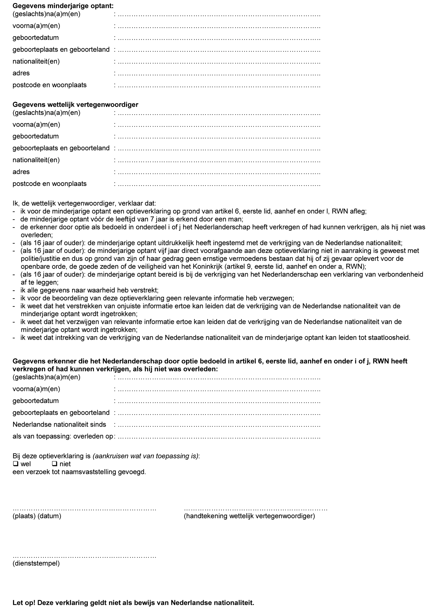 Model 1.41 HRWN-BES: Optieverklaring minderjarige op grond van artikel 6, eerste lid, aanhef en onder k, RWN (afgelegd door wettelijk vertegenwoordiger) komt te luiden als aangegeven in bijlage 13.
