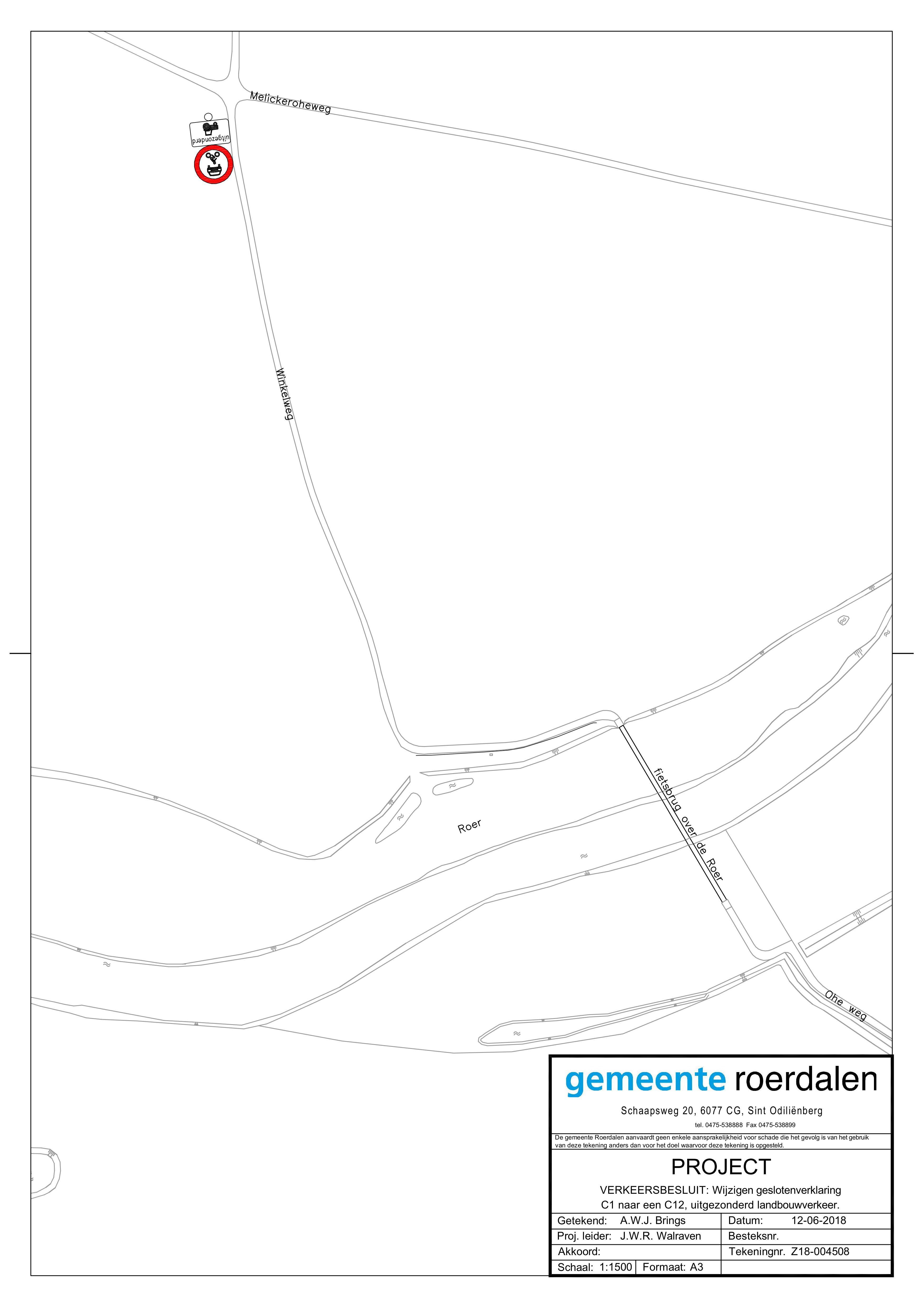 De geslotenverklaring in beide richtingen voor voertuigen, ruiters en geleiders van rij- of trekdieren of vee te wijzigen in een geslotenverklaring voor alle motorvoertuigen, uitgezonderd landbouwverkeer, aan de Winkelweg in de Melicker Ohé te Melick. Concreet betekent dit dat het verkeersbord C1 (RVV 1990) inclusief het onderbord OB04 wordt vervangen door het verkeersbord C12 (RVV 1990) inclusief onderbord OB55.
