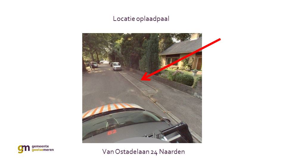 De gemeente Gooise Meren heef besloten om een oplaadpaal te laten plaatsen in de Van Ostadelaan te Naarden ter hoogte van de woning met huisnummer 24. Op de tekening dat bij dit verkeersbesluit hoort is de locatie aangegeven. Voor het opladen worden twee parkeerplaatsen gereserveerd waarop alleen auto’s mogen parkeren die kunnen worden opgeladen. Om het reserveren van de twee parkeerplaatsen juridisch mogelijk te maken is dit verkeersbesluit genomen.