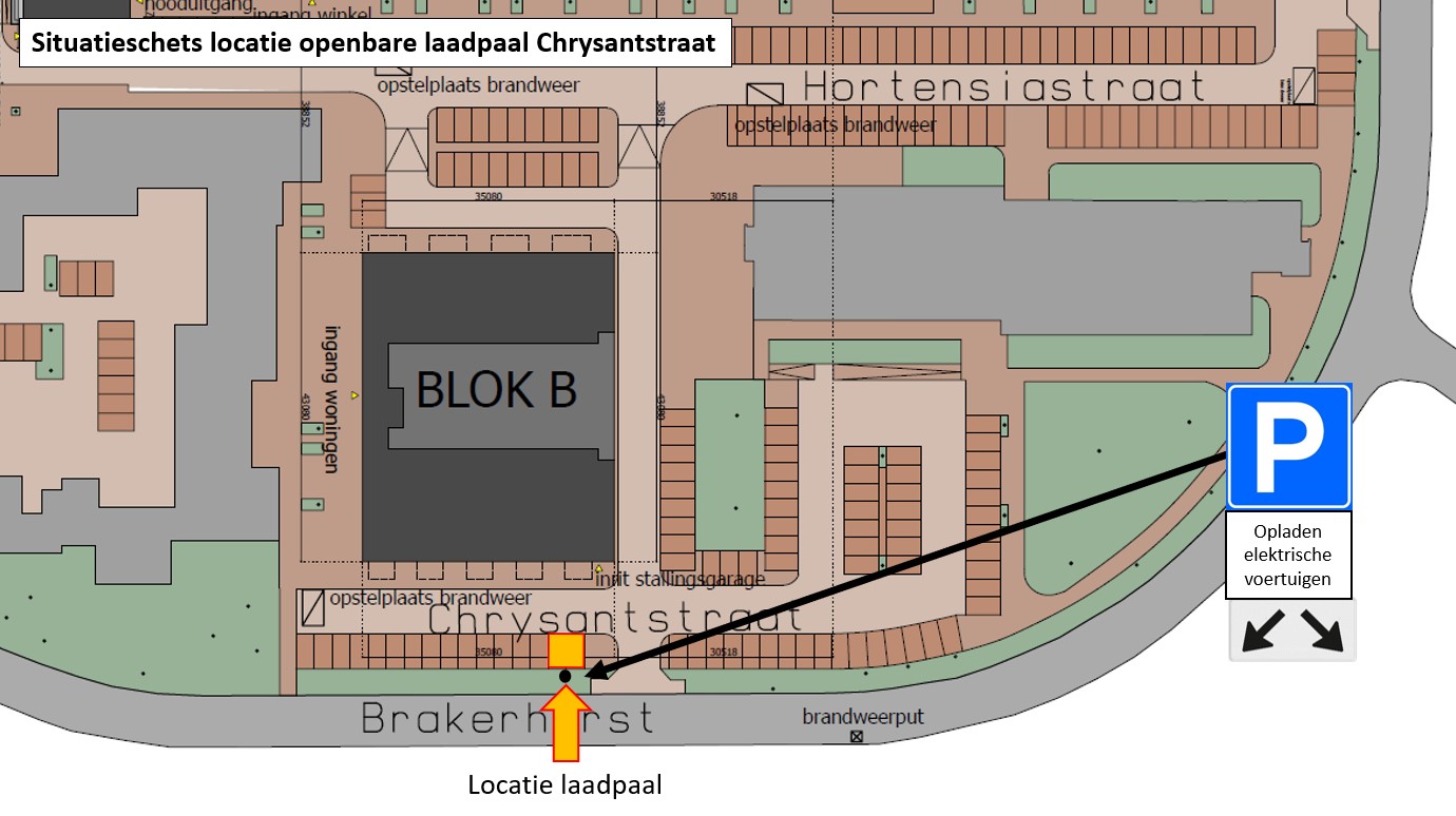 - Door het plaatsen van verkeersbord E4 met onderbord ‘Opladen elektrische voertuigen’ en onderbord OB504 (schuine pijl links en/of rechts) volgens bijlage 1 van het RVV 1990 twee parkeerplaatsen aan te wijzen op het parkeerterrein van de Chrysantstraat, direct ten westen van de aansluiting met de Brakerhorst, die het opladen van elektrische voertuigen als specifiek doel hebben.