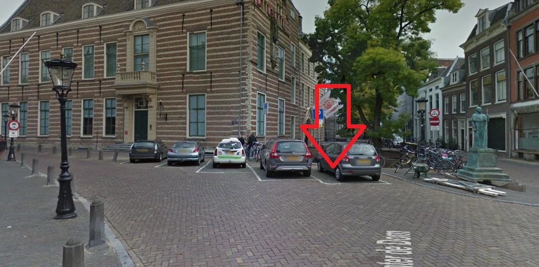 Pausdam (ter hoogte van het standbeeld op de hoek met de Kromme NIeuwegracht; komende vanaf de Kromme Nieuwegracht betreft het het eerste parkeervakvak, direct naast het standbeeld, aan de rechterkant van de weg tegenover Pausdam huisnummer 3; wegvak: tussen de Kromme Nieuwegracht en Achter St. Pieter)