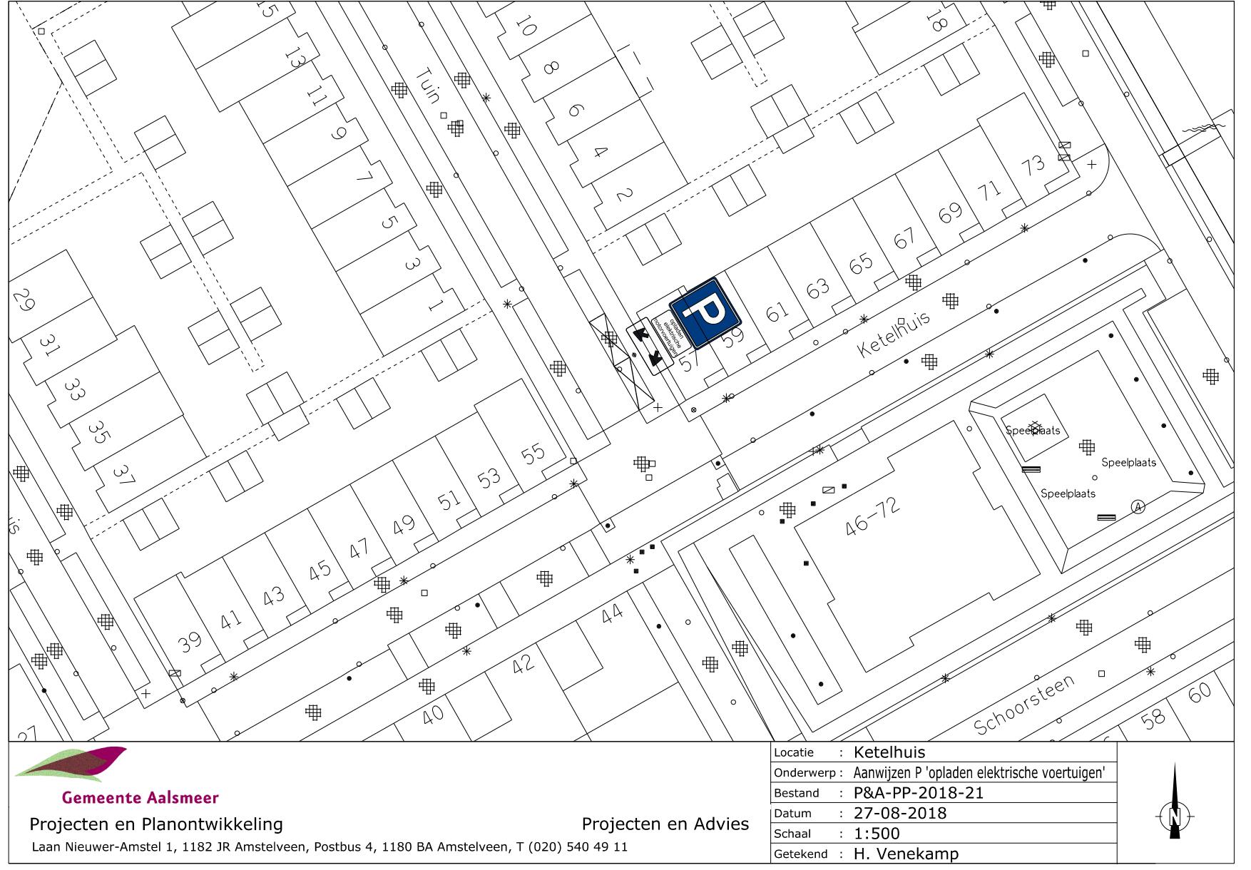 Burgemeester en wethouders van Aalsmeer besluiten om twee parkeerplaatsen aan de oostkant van Tuin bij de kruising met Ketelhuis aan te wijzen als parkeerplaats voor het opladen van elektrische motorvoertuigen. De parkeerplaatsen mogen alleen gebruikt worden voor het opladen van deze elektrische motorvoertuigen.