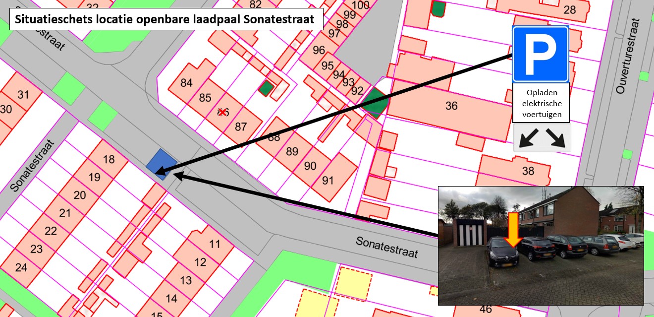 - Door het plaatsen van verkeersbord E4 met onderbord ‘Opladen elektrische voertuigen’ en onderbord OB504 (schuine pijl links en/of rechts) volgens bijlage 1 van het RVV 1990 twee parkeerplaatsen aan te wijzen op de Sonatestraat, direct ten noorden van het perceel Sonatestraat 18, die het opladen van elektrische voertuigen als specifiek doel hebben.