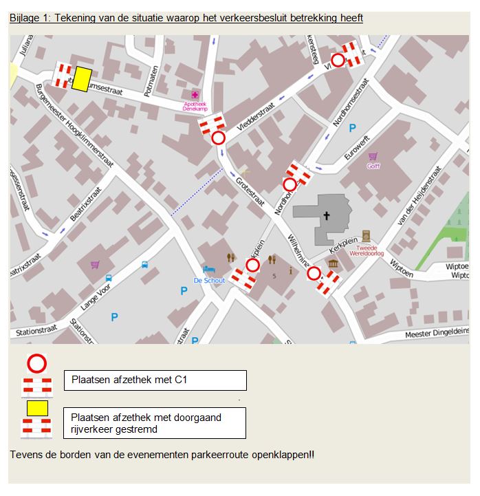 Door plaatsing van afzethekken met bord C1 op zondag 16 december 2018 van 07.00 uur tot 00.00 uur zoals op tekening (bijlage 1) is aangegeven.