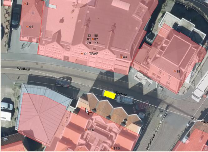 Aan de Westwal maakt één van de parkeerplaatsen aan de overzijde van Stadsgraav’n plaats voor een gereserveerde gehandicaptenparkeerplaats. Dat is de parkeerplaats die met een geelvlak is aangegeven op de kaart hieronder: