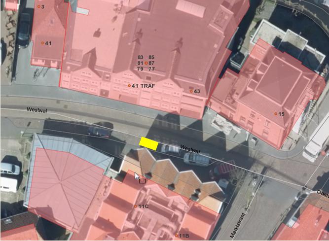 Aan de Westwal maakt één van de parkeerplaatsen aan de overzijde van Stadsgraav’n plaats voor een gereserveerde gehandicaptenparkeerplaats. Dat is de parkeerplaats die met een geelvlak is aangegeven op de kaart hieronder: