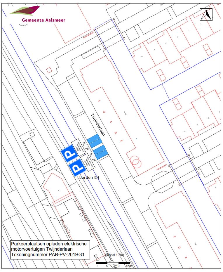 Burgemeester en wethouders van Aalsmeer besluiten om vier parkeerplaatsen in de Twijnderlaan aan te wijzen als parkeerplaats voor het opladen van elektrische motorvoertuigen. De parkeerplaatsen mogen alleen gebruikt worden voor het opladen van deze elektrische motorvoertuigen.