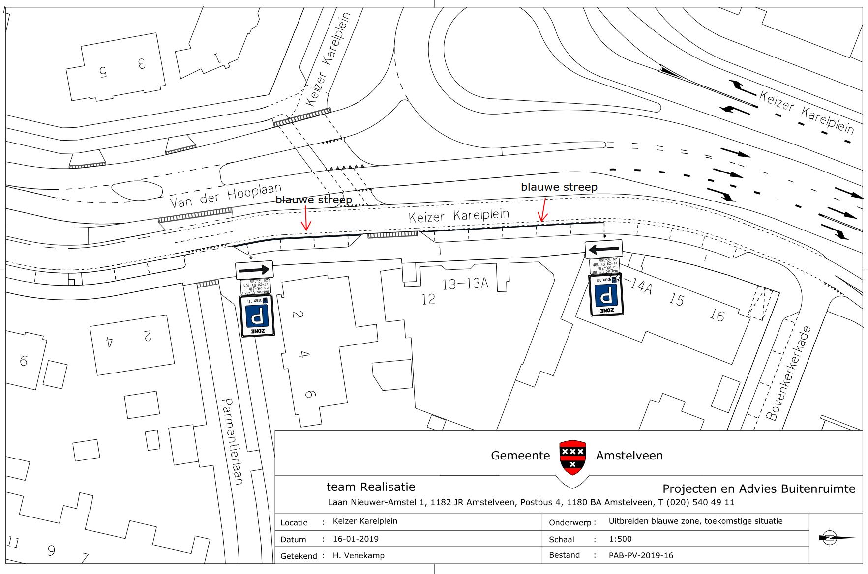 Burgemeester en wethouders van Amstelveen besluiten om de parkeerschijfzone aan de oostkant van het Keizer Karelplein te verlengen, waarbij het aantal plaatsen met een blauwe streep met vier parkeerplaatsen wordt uitgebreid tot in totaal acht plaatsen. De maximale parkeerduur is 1 uur. De tijden gelden van maandag tot en met zaterdag van 09.00 uur tot 18.00 uur, op donderdag tevens van 18.00 uur tot 21.00 uur en op zondag van 12.00 uur tot 18.00 uur. Zij geven dit aan met borden E10 en E11 van bijlage 1 van het Reglement verkeersregels en verkeerstekens 1990 met opschrift “max 1h” en door het aanbrengen van blauwe strepen als bedoeld in artikel 25, lid 1, van dit Reglement, zoals aangegeven op tekening PAB-PV-2019-16.