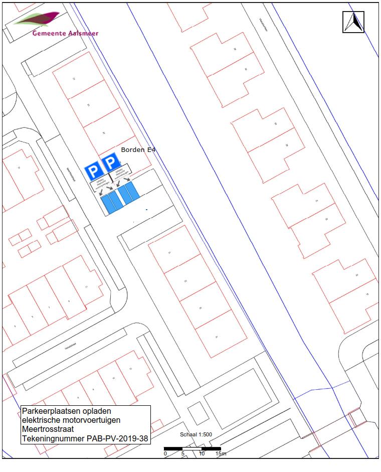 Burgemeester en wethouders van Aalsmeer besluiten om vier parkeerplaatsen in de Meertrosstraat aan te wijzen als parkeerplaats voor het opladen van elektrische motorvoertuigen. De parkeerplaatsen mogen alleen gebruikt worden voor het opladen van deze elektrische motorvoertuigen.