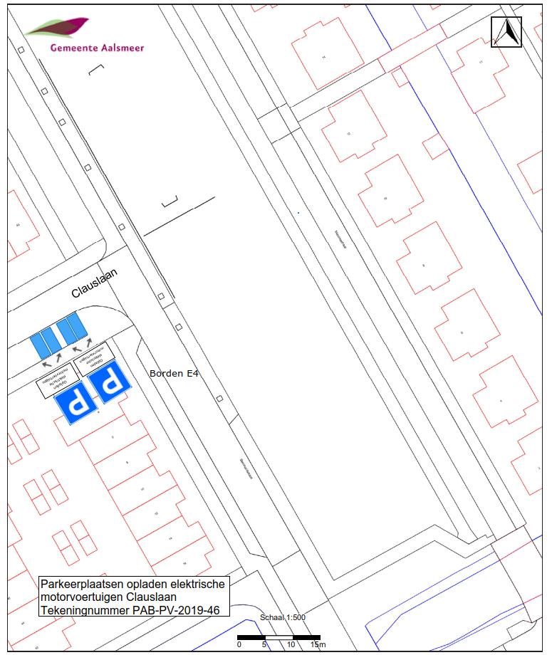 Burgemeester en wethouders van Aalsmeer besluiten om vier parkeerplaatsen in de Clauslaan aan te wijzen als parkeerplaats voor het opladen van elektrische motorvoertuigen. De parkeerplaatsen mogen alleen gebruikt worden voor het opladen van deze elektrische motorvoertuigen.
