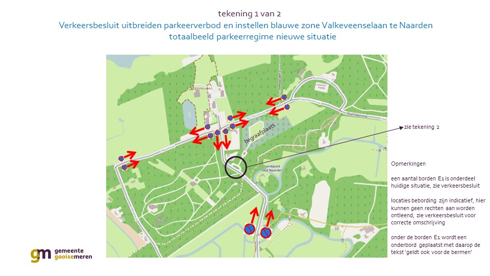 Op de Valkeveenselaan te Naarden het huidige parkeerverbod uit te breiden door het (ver)plaatsen van bord E1 zoals opgenomen in bijlage I van het RVV1990 plus het onderbord met daarop de tekst ‘geldt ook voor de bermen’, waardoor in de nieuwe situatie niet meer mag worden geparkeerd aan beide zijden op