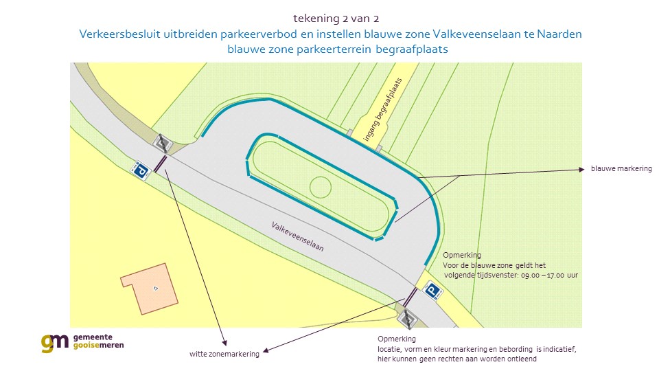 Er kunnen geen twee parkeerregimes gelijktijdig van kracht zijn. Door het instellen van de blauwe zone op het terrein naast de begraafplaats vervalt het huidige parkeerverbod naast de begraafplaats aan de zijde van de Valkeveenselaan.