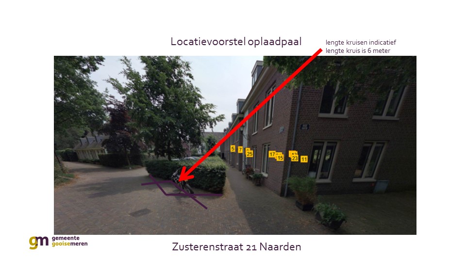 De gemeente Gooise Meren heef besloten om een oplaadpaal te laten plaatsen in de Zusterenstraat te Naarden ter hoogte van de woning met huisnummer 21. Op de tekening dat bij dit verkeersbesluit hoort is de locatie aangegeven. Voor het opladen worden twee parkeerplaatsen gereserveerd waarop alleen auto’s mogen parkeren die kunnen worden opgeladen. Om het reserveren van de twee parkeerplaatsen juridisch mogelijk te maken is dit verkeersbesluit genomen.