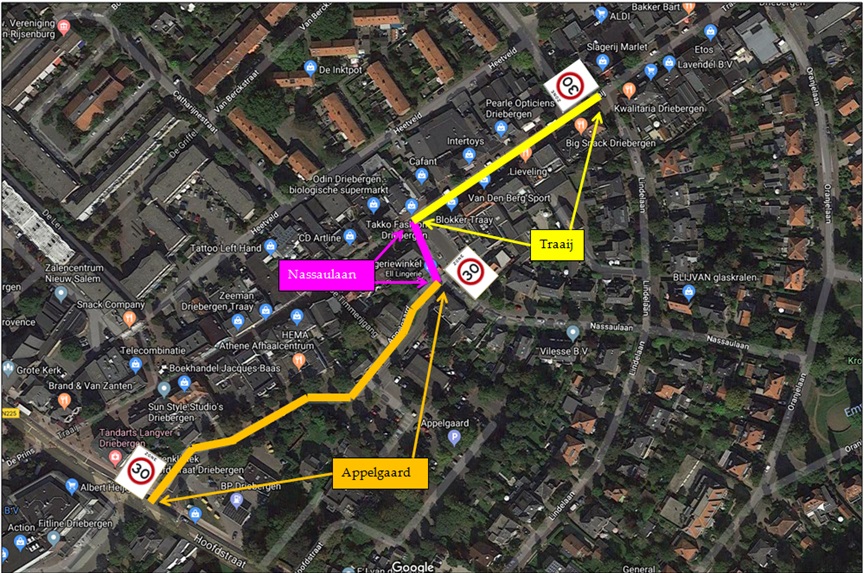 In het GVVP wordt de Traaij (tussen Nassaulaan en Oranjelaan) als erftoegangsweg (30 km) gecategoriseerd. Deze categorisering sluit ook aan bij de huidige weginrichting. Het is daarom raadzaam om de maximale snelheid van 30 km aan te sluiten op de weginrichting en het GVVP.