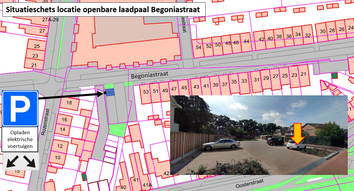 Door het plaatsen van verkeersbord E4 met onderbord ‘Opladen elektrische voertuigen’ en onderbord OB504 (schuine pijl links en/of rechts) volgens bijlage 1 van het RVV 1990 twee parkeerplaatsen aan te wijzen op de Begoniastraat, direct ten westen van Begoniastraat 53, die het opladen van elektrische voertuigen als specifiek doel hebben.