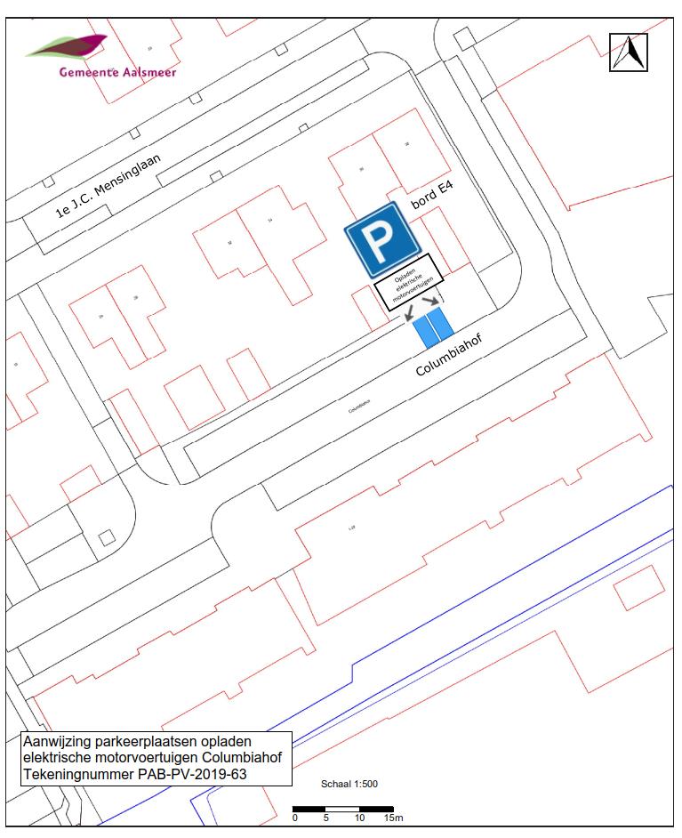 Burgemeester en wethouders van Aalsmeer besluiten om twee parkeerplaatsen op het Columbiahof aan te wijzen als parkeerplaats voor het opladen van elektrische motorvoertuigen. De parkeerplaatsen mogen alleen gebruikt worden voor het opladen van deze elektrische motorvoertuigen.