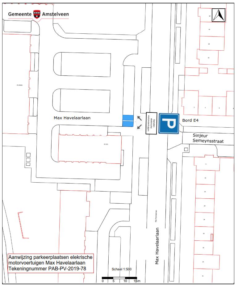 Burgemeester en wethouders van Amstelveen besluiten om twee parkeerplaatsen op het parkeerterrein in de Max Havelaarlaan tegenover de Sinjeur Semeynsstraat aan te wijzen als parkeerplaats voor het opladen van elektrische motorvoertuigen. De parkeerplaatsen mogen alleen gebruikt worden voor het opladen van deze elektrische motorvoertuigen.