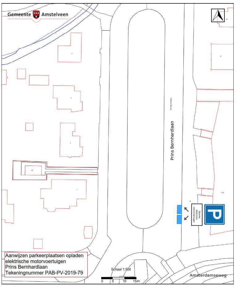 Burgemeester en wethouders van Amstelveen besluiten om twee parkeerplaatsen aan de Prins Bernhardlaan (oostzijde) aan te wijzen als parkeerplaats voor het opladen van elektrische motorvoertuigen. De parkeerplaatsen mogen alleen gebruikt worden voor het opladen van deze elektrische motorvoertuigen.