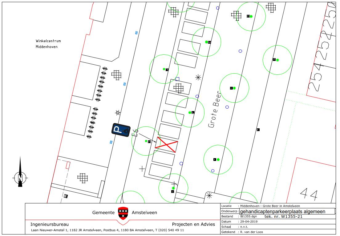 Burgemeester en wethouders van Amstelveen besluiten een algemene gehandicaptenparkeerplaats aan te wijzen op het parkeerterrein van Grote Beer aan de oostkant van het winkelcentrum Middenhoven. Deze plaats vervangt tijdelijk de algemene gehandicaptenparkeerplaats aan de noordkant van de Melkweg bij de zuidelijke ingang van het genoemde winkelcentrum.